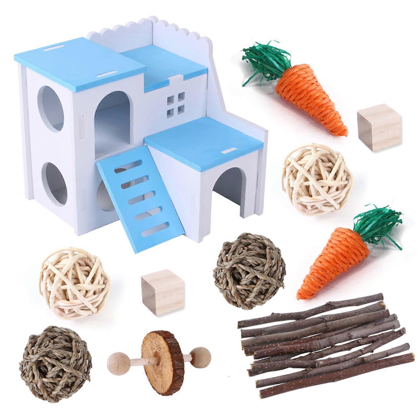 Hamster Chew Toys Set, Rattan Balls and Wooden Villa, Durable Small Animal Cage House, 11 Pieces for Guinea Pigs