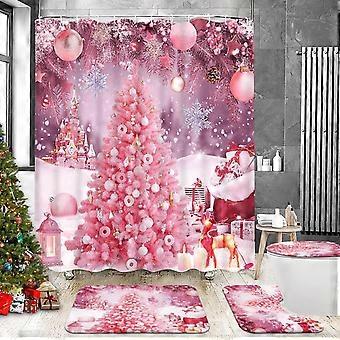 4 Pcs Christmas Shower Curtain Set with Non-Slip Rugs, Toilet Cover & Bath Mat, Snowflake Design, Pink Holiday Bathroom Set