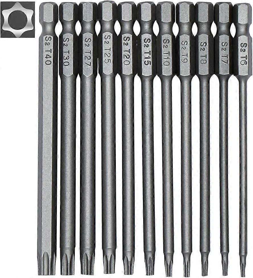 Set of 11 Long Torx Bits for Screwdrivers and Electric Screwdrivers - Magnetic Bits - 1/4" Hex Shank - Sizes T6 to T40 - Length 100mm