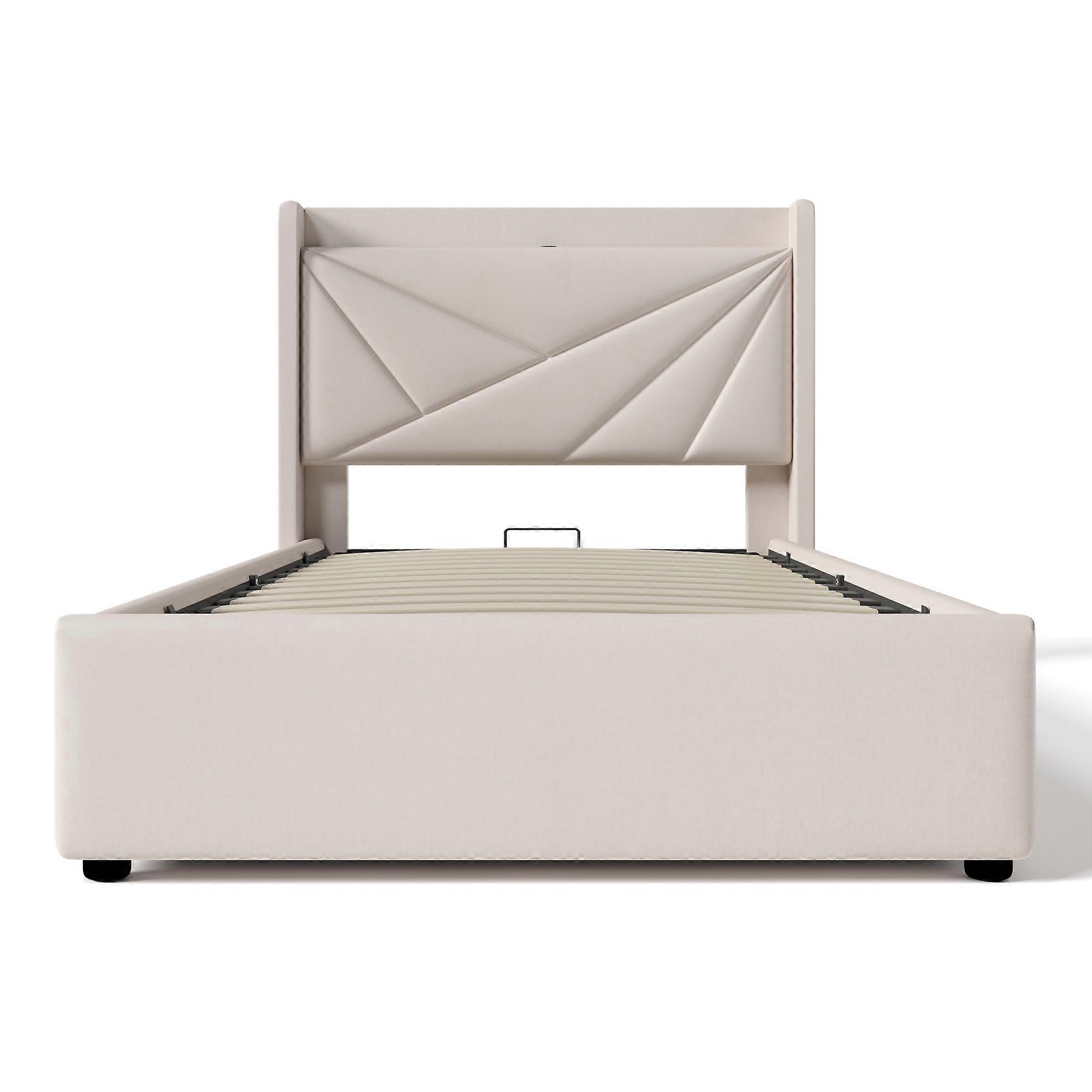 Single Storage Bed USB C Charging Linen Headboard 90x200cm Mattress Slatted Base