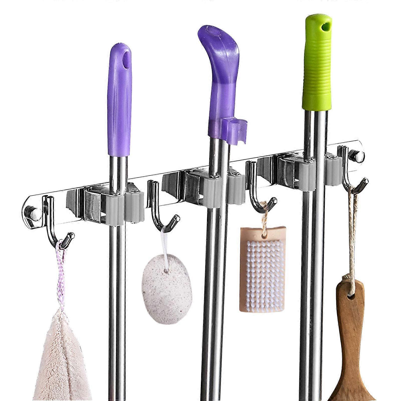 Wall Broom Holder - Stainless Steel Broom Hanger, Storage Hanger Holder for Kitchen, Laundry Room, Garage (3 Slots and 4 Hooks, Gray)