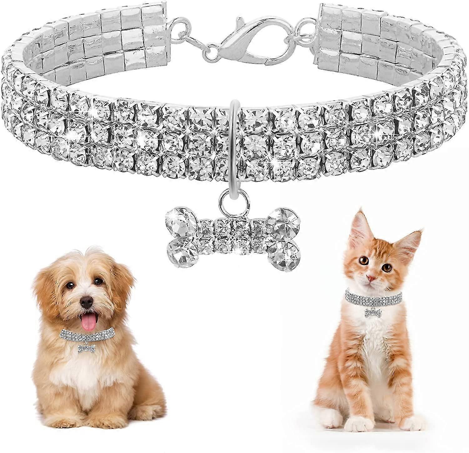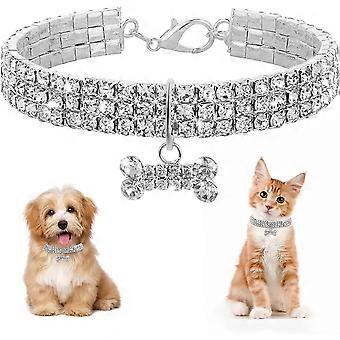 Rhinestone Pet Collar Crystal Diamond Elastic Adjustable Collar With Pendant For Puppy Kitten (bone)