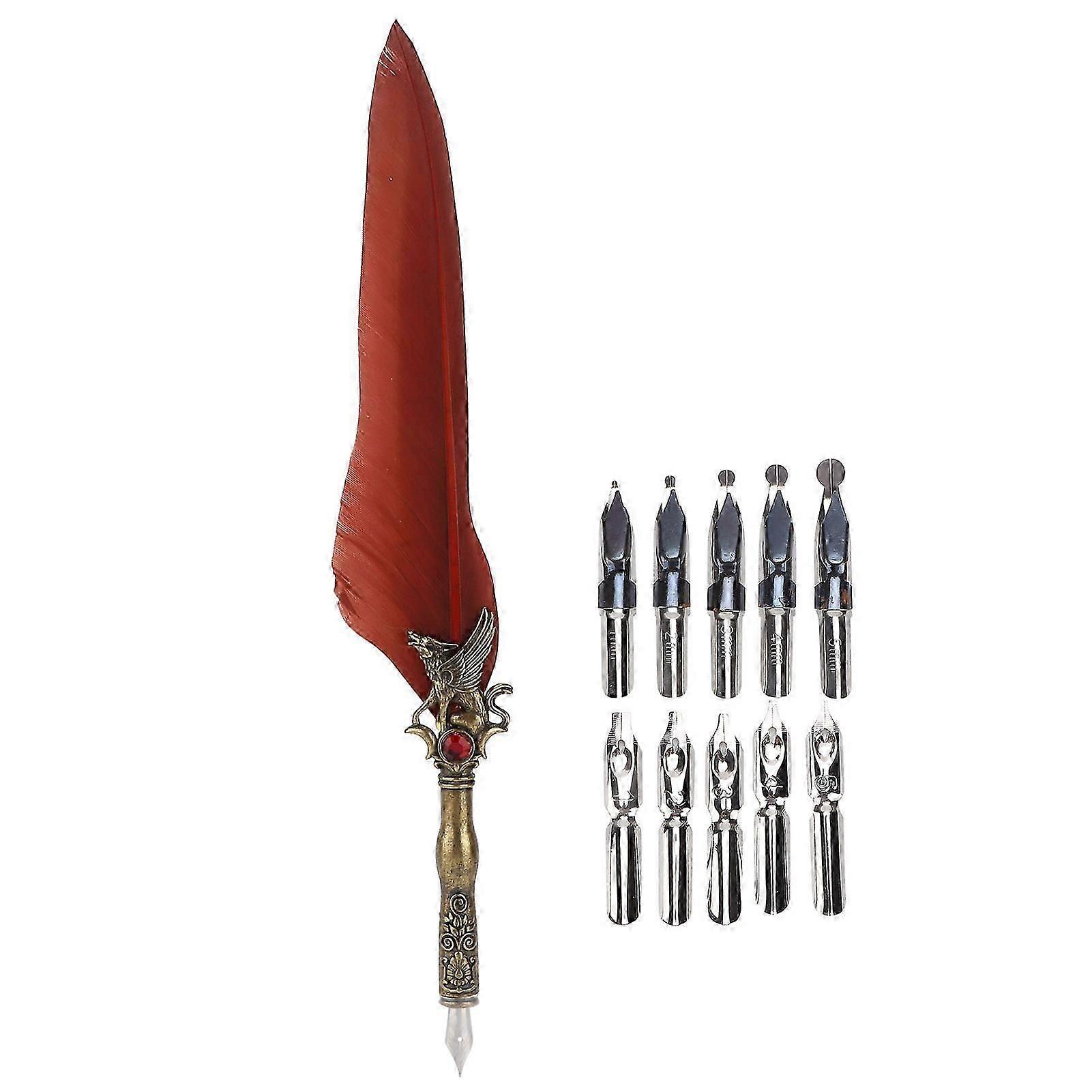 Feather Pen Craft Retro Carved Stainless Steel Dip Pencil for Signature Gift Table DecorationBrown Red