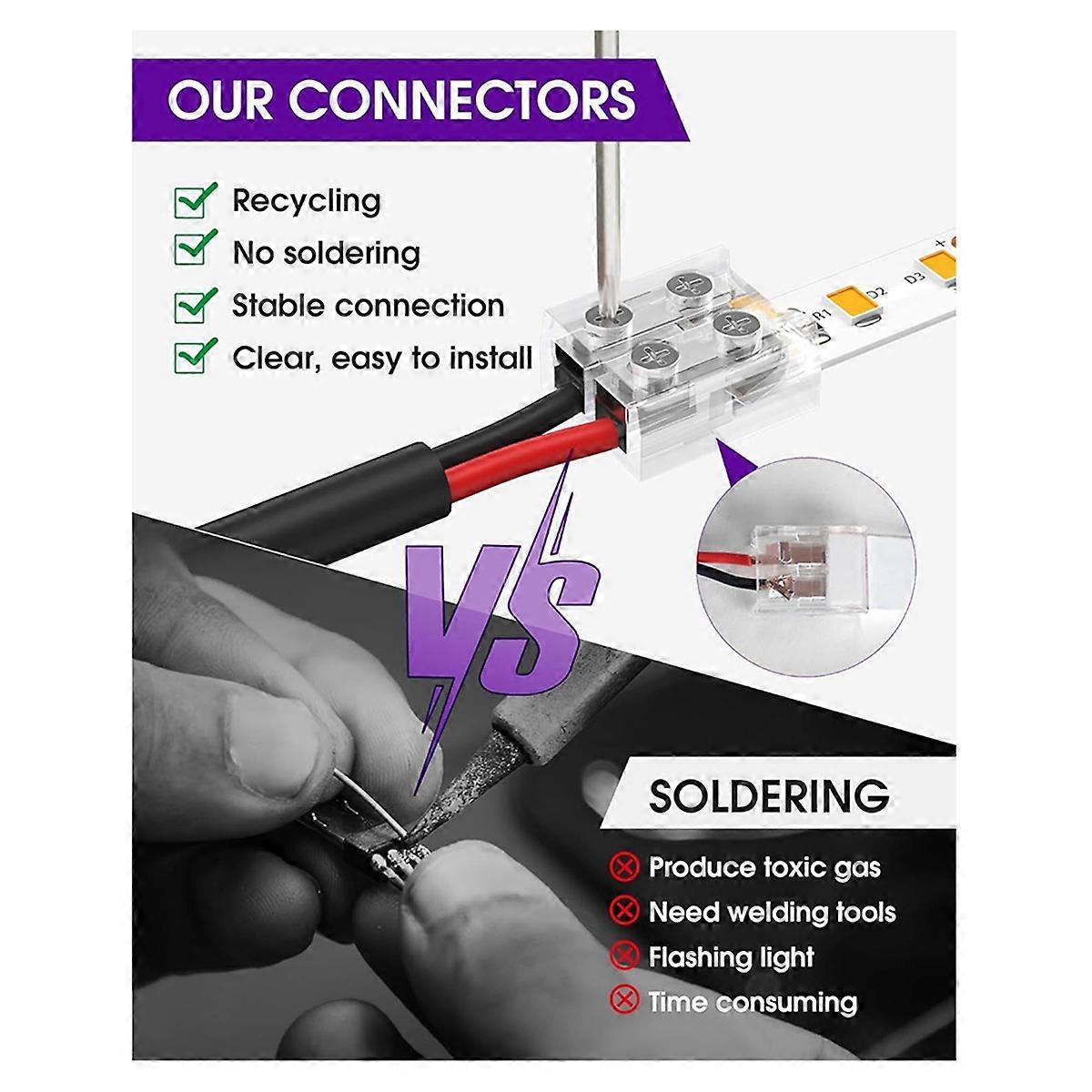 Only for 8mm wide single color white led strips. Installation notes:1. metal in connector touches light strip; 2. the connection is correct with positive to positive. Wide Compatibility - 2Pin 8mm led strip light connectors are suitable for most SMD LED Tape Lights or COB LED Strip Lights. Great for living room, kitchen, bedroom, staircase, cabinet, display shelf, bookshelf, mirror, etc. Thoughtful LED Connectors Kit - With transparent design, our led tape lights connector is stylish and aesthetics, you can clearly see the inner structure and installation of this led strip connectors, convenient and quick, never waste your time. Multiple Applications - Extending light strips or DIY decorations for your room? They can do all your needs. Solderless LED lights Connectors can be reused, suitable for home accent lighting or commercial use. Easy to Operate - No need to solder, just plug the strip and wire into the connector and tighten the screw with the screwdriver. 12 strip to wire screw led connectors Color: Transparent & Silver Material: Plastic+Metal Package Contents: 12 Pack * LED Connector Only the above package content, other products are not included. Note: Light reflection and different displays may cause the color of the item in the picture a little different from the real thing. The measurement allowed error is +/- 1-3cm.