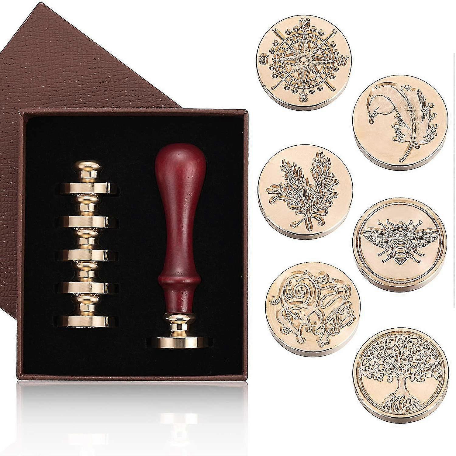Wax Seal Stamp Set,6pc Sealing Wax Stamps Copper Seals 1 Wooden Handle