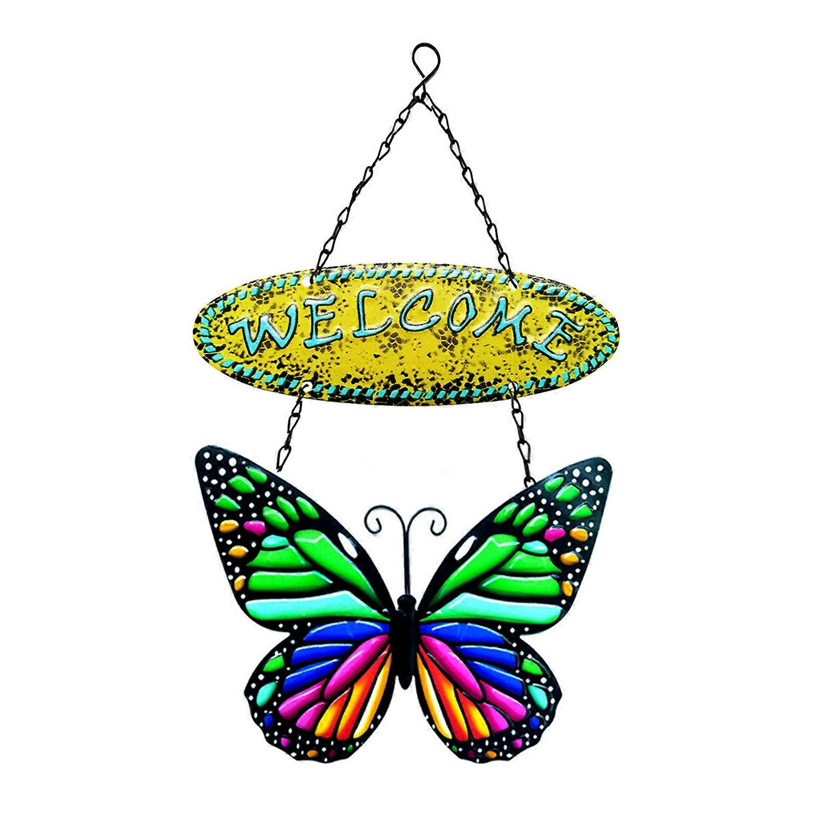 Wrought Iron for Butterfly Welcome Sign Wall Art Decor Hanging Plaque Ornament for Farmhouse Garden Front Door Decoration Gift Supplies Yellow