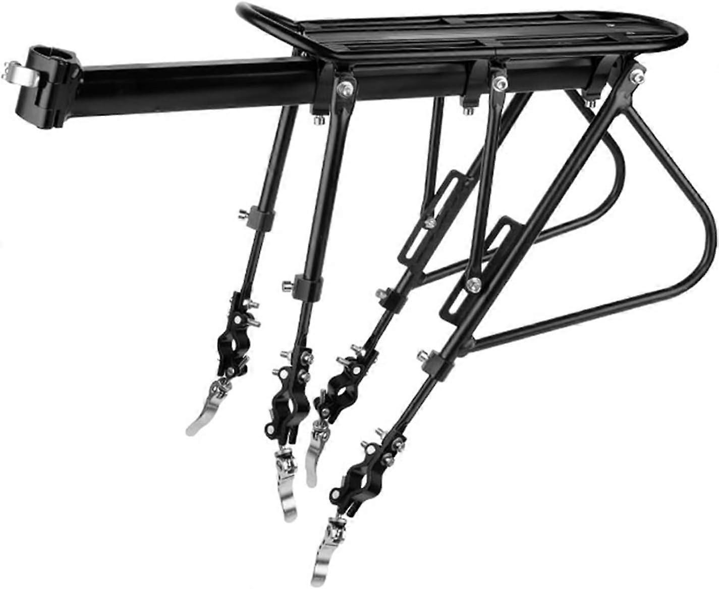 1.1: The back frame is made of quality hard aluminum alloy with 5point fixing and 6point support, ensuring a stable structure and strong loadbearing capacity. The thickened tube diameter is approximately 10 mm. 2.2: This bike rack features a widened rear bracket that effectively protects your items and bike bags from tire scratches or rolling into the wheels. 3.3: It can support loads of up to 100kg when the screws are tightened. The bicycle pannier rack meets all your daily carrying needs, allowing you to use it with confidence. 4.4: The rear frame of this bike adopts a quickrelease design. The quickrelease main carrier is easy to install and remove, and it comes with nonslip seals to prevent scratches on the seat tube.