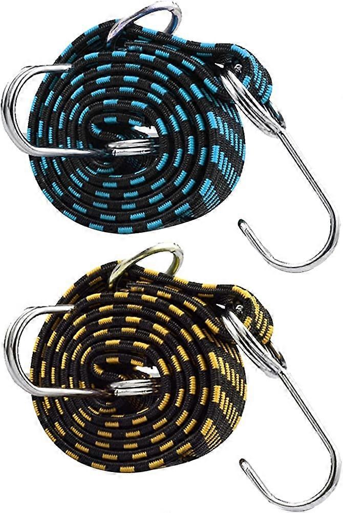 Package Included---You Will Get 2Pcs Adjustable Flat Bungee Cords, Package Includes 2Pcs Luggage Cords, Yellow And Blue. You Can Choose 1M Or 2M Luggage Rope. Suitable for Various Activities And Sufficient Amount for Your Daily Use. .Ideal Material --- The Bungee Cords Are Made of High Quality Latex And Oxford Fiber, Which Makes Them Much Stronger And Elastic. The Nylon Yarn Outer Material Has Good Weather Resistance, Which Allows It to Be Used for A Long Time Without Deformation. .Strong Hook --- Made of Zinc-Plated Steel, The Hook Will Not Break Or Rust, And Adopts Triangular Ring Hook Design for More Even Power. The Elastic Rope End Knot Is Fixed With A Durable Metal Buckle, Not Easy to Rust And Does Not Bear Heavy Weight. .Stable And Non-Slip --- Adjustable Flat Design Elastic Strap Can Prevent Slipping And Improve Cargo Security. The Wide Bungie Cord With 3 Cm Wide Hook, Very Suitable to Distribute The Pressure On A Large Loading Area. .Widely Use---The Adjustable Elastic Band Can Meet Many Different Needs. It Can Be Used Not Only for Fixing Bicycle, Flatbed, Boat, Car, Truck, Trailer, Motorcycle And Other Outdoor Activities, But Also for Fixing Garbage Can, Camping, Tent, Heavy Objects, Tarpaulin, Clothesline, Gardening And Other Indoor Outdoors. .