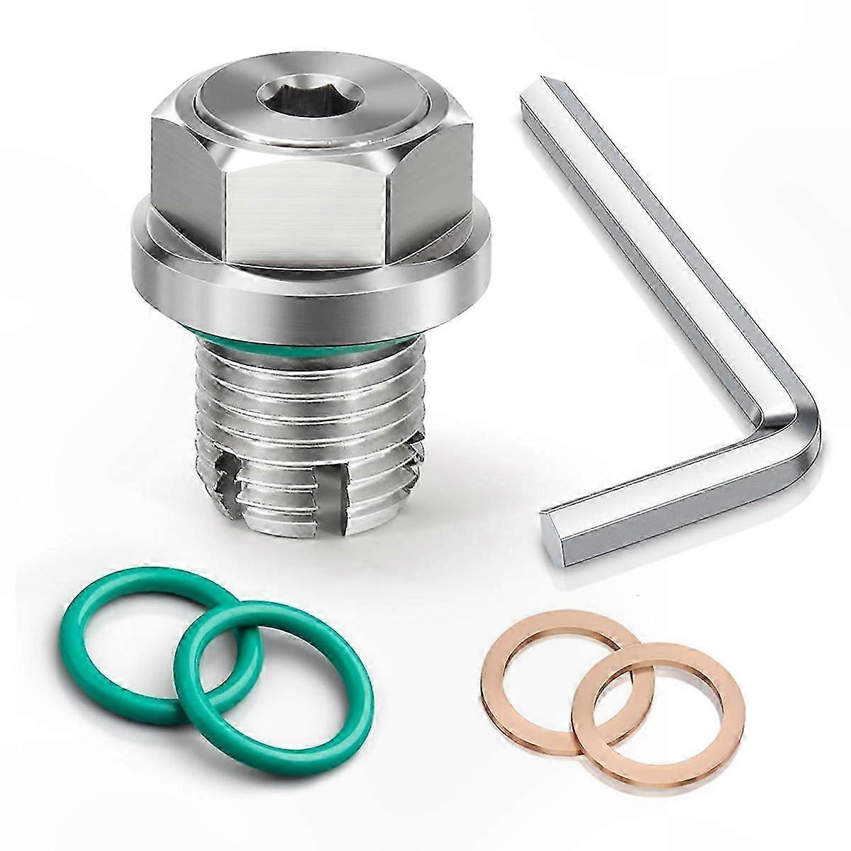 Crafted using advanced CNC technology, the Oversized Piggyback Oil Drain Plug is made from premium stainless steel 304. This plug re-threads your oil pan with precision and ensures a secure, leak-free fit, enhancing the durability and reliability of your engine. Save time and money with our easy-to-install oil drain plug. Avoid the costly replacement of your oil pan by using our self-tapping plug that matches the original fit and function. Rigorous testing guarantees a reliable seal, preventing leaks and maintaining engine health. The piggyback oil drain plug offers a superior alternative to traditional thread repair tools. It simplifies the repair process, eliminates the need for perfect alignment, and reduces the risk of oil leaks, making it an ideal solution for quick and effective thread repair. This kit includes everything needed for installation: one stainless steel piggyback oil drain plug (M14.1-1.5 x 15mm), an L-shaped hex wrench, two fluorine O-rings for the main plug, and two gaskets for the piggyback drain plug. Installation is straightforward: clean the thread area of the oil pan, thread the main plug in and out to cut new threads, clean the area, and tighten with a T-socket wrench to approximately 14 ft-lbf. This process ensures a secure, reliable fit and extends the lifespan of your oil pan. Note: Slight color variations due to lighting or display differences may occur and do not affect product performance. Measurement error is +/- 1-3 cm. Color: Silver Material: Stainless Steel Package Contents: 1 x Self-Tapping Oil Pan Thread Repair Kit Note: Other accessories shown in images are not included.