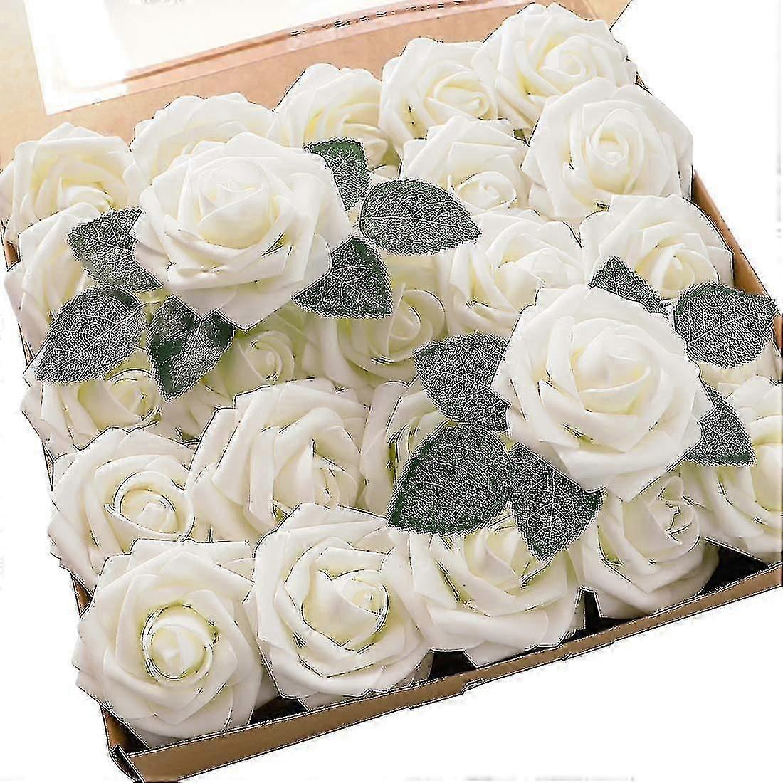 Artificial Flowers 25pcs Real Looking Ivory Foam Fake Roses With Stems For Diy Wedding Bouquets Whit