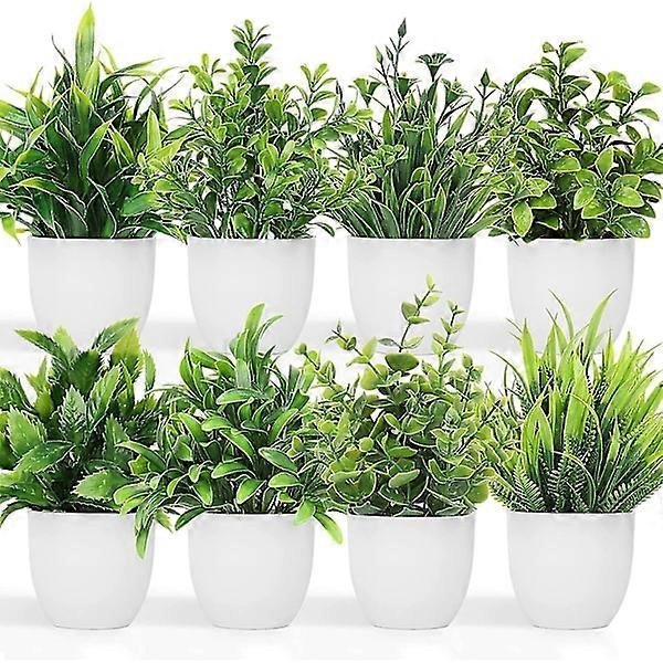 Artificial Plants Small Fake Potted Plants, 8 Pcs Mini Eucalyptus Potted Plants Faux Grass Plant with White Pot for Home Decor, Indoor, Office, De