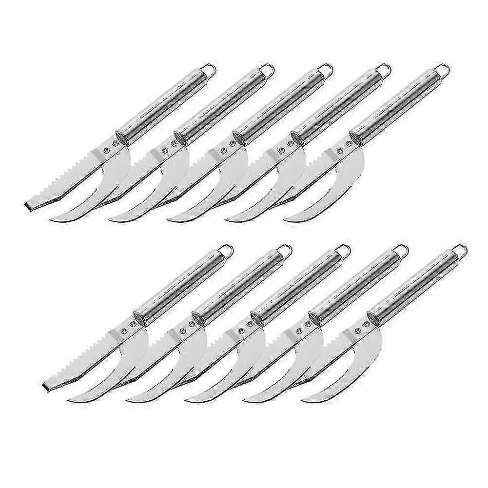 Fish Scale Knife: This fish scale tool can be applied to kill fish and remove the fish scales, non-slip handle is designed with the ergonomic in sturdy shape for easy turning without hurting you, a good helper for you in kitchen.Multi-function: versatile design makes this fish scaler very efficient and simple to scraping scales. Open belly/dig out/remove scalesHigh Quality: This Fish Scale Knife Made of Food Stainless Steel. Sturdy, Lightweight, and Anti-Rust.Easy To Clean: This fish scraper can be easily rinsed to clean up. An essential fish scaler scale remover perfect for chef and home to use.Suits Scenes: Such as home, picnic, restaurant and more.Also can be a good housewarming gift for your .Color: silverMaterial: Stainless steelPackage Contents:10 x fish scale planerOnly the above package content, other are not included.Note: Light reflection and different displays may cause the color of the item in the a little different from the real thing. The measurement allowed error is +/- 1-3cm.