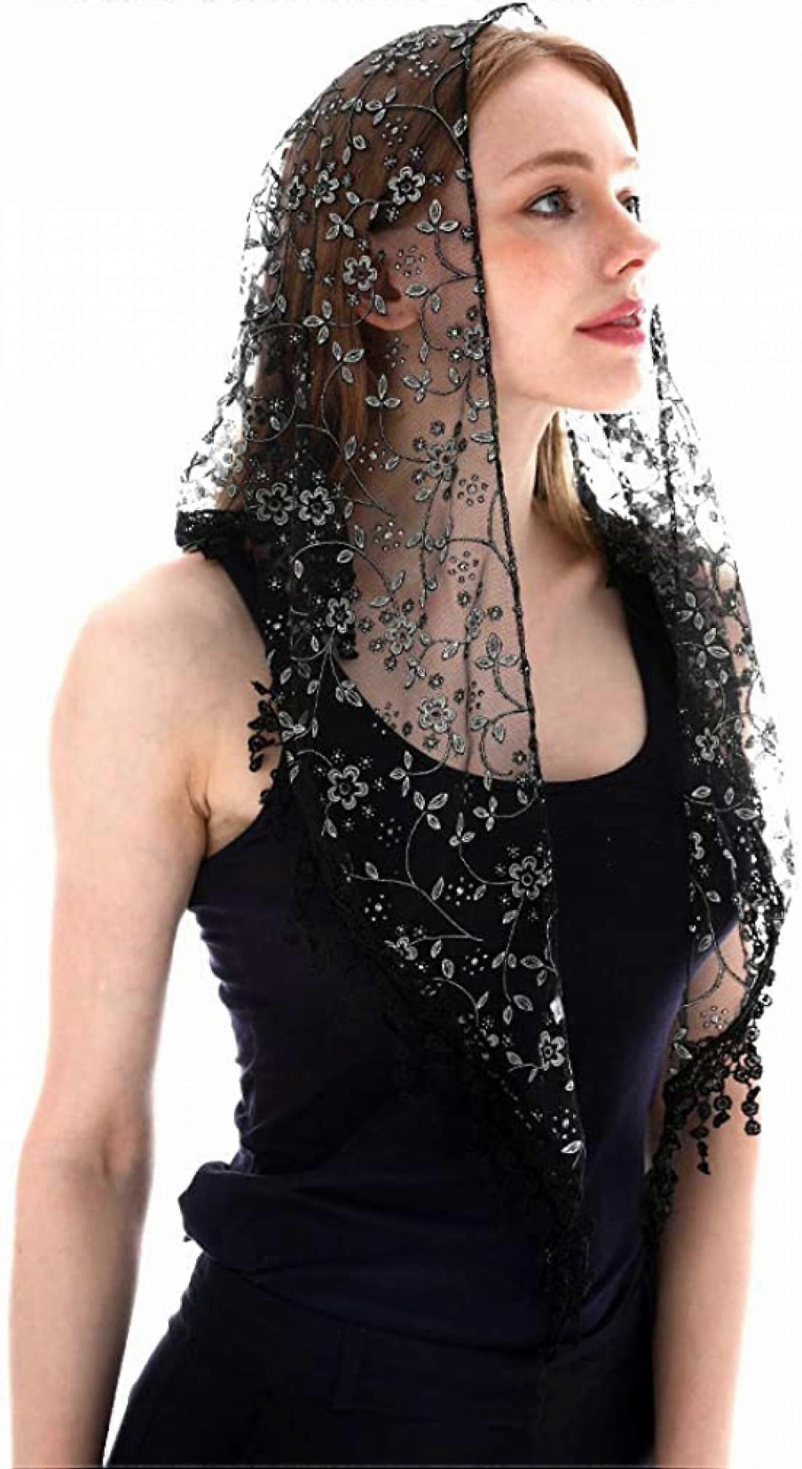Triangle Lace Bride Veil Tulle Scarf Covering Church Veil for Mass Wedding Bridesmaids, Black