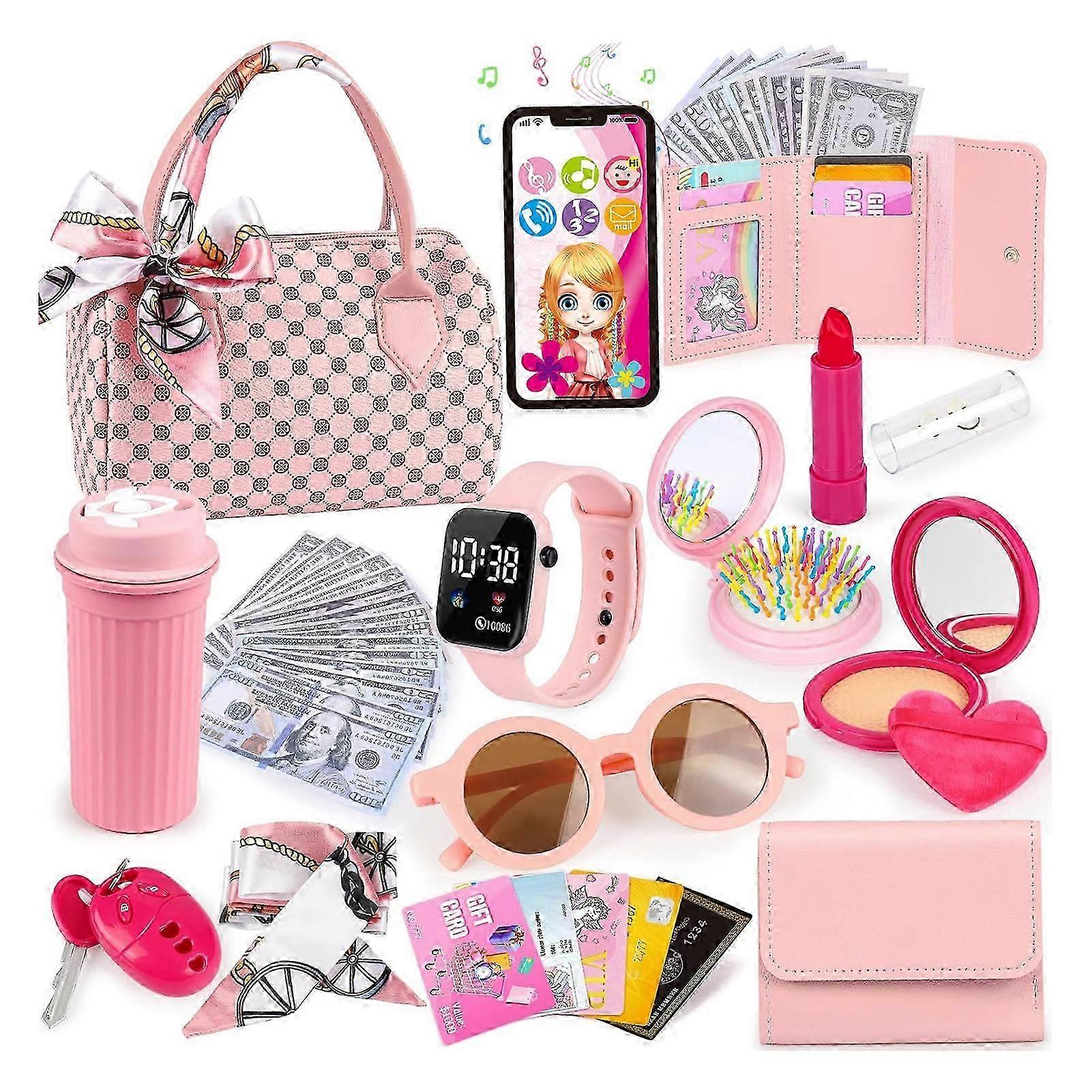 Play Purse for Little Girls, Princess Pretend Play Set, Play Handbag with Mobile Phone & Makeup Toys for Girls Gift (31pcs)