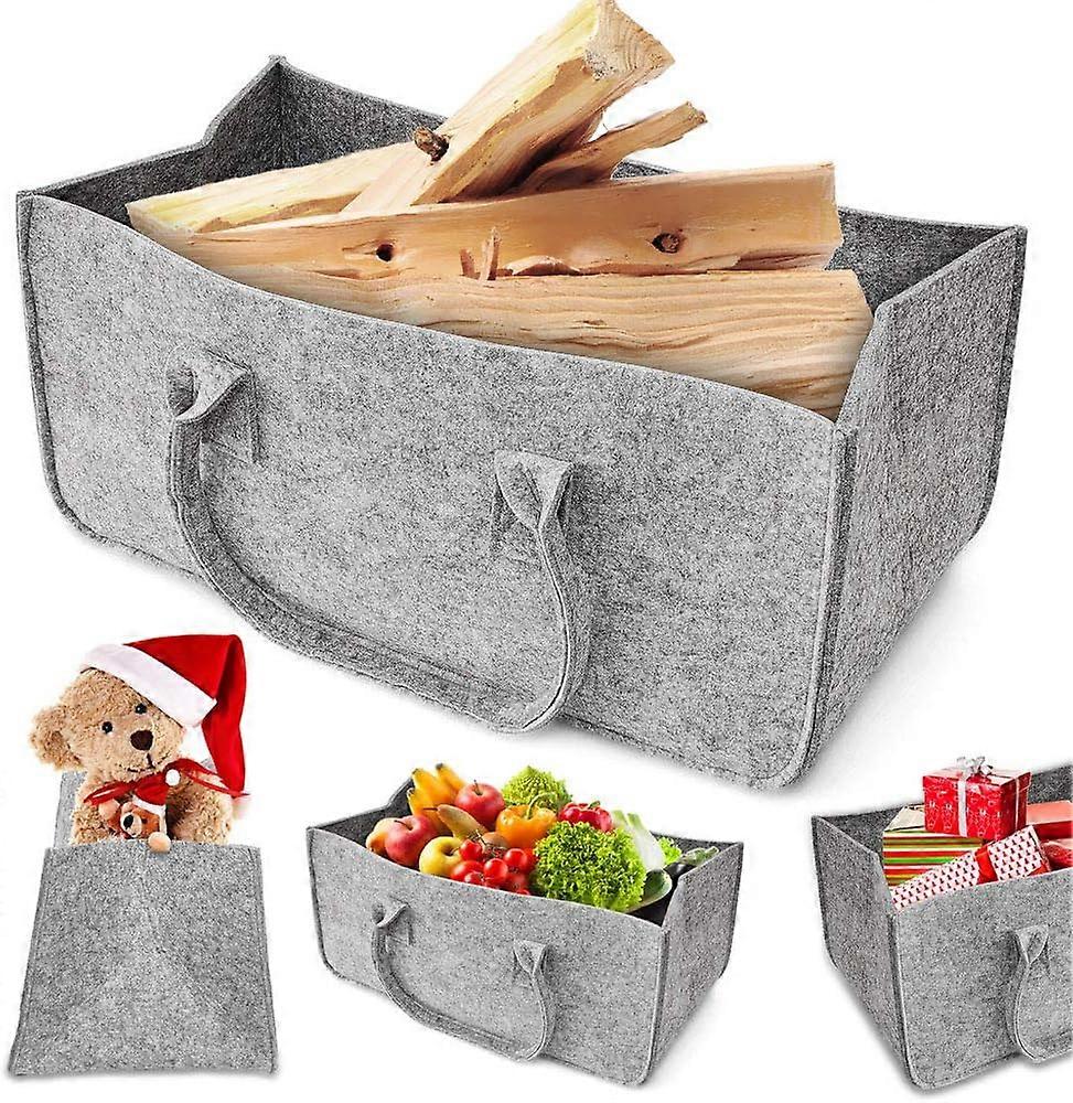1. SIZE:; The premium felt bag is made of 5mm sturdy felt, 5mm thick felt makes the bag resistant and stable. Maximum load of approx. 15 kg.^<br>2. LOOK: Rectangular organizing and storage basket, visually appealing, decorative design - gentle material for every surface.^<br>3. EASY TO USE: Felt bag Very robust and has 2 handles for easy transport. The bag can be folded up and is therefore space-saving.^<br>4. COMFORT: can be used in various situations, easy to transport thanks to its wide, the bag has a large capacity to transport as many logs as possible.^<br>5. FOR TRANSPORT AND STORAGE: the all-purpose basket is ideal for transporting wood and coal briquettes, you can also use the basket as a newspaper and magazine basket, etc.^