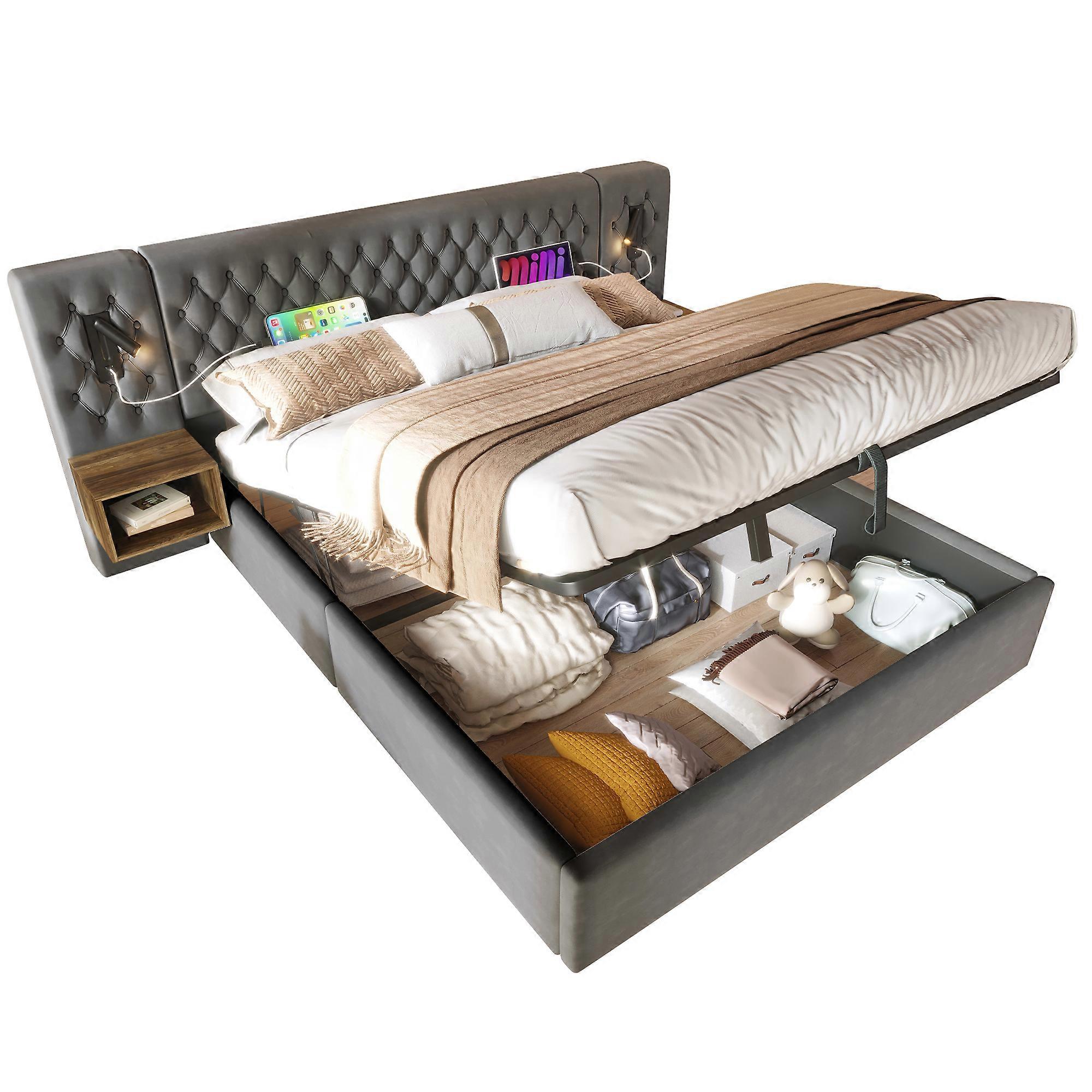 Grey Velvet Hydraulic Storage Double Bed 160x200cm Nightstands USB Mattress