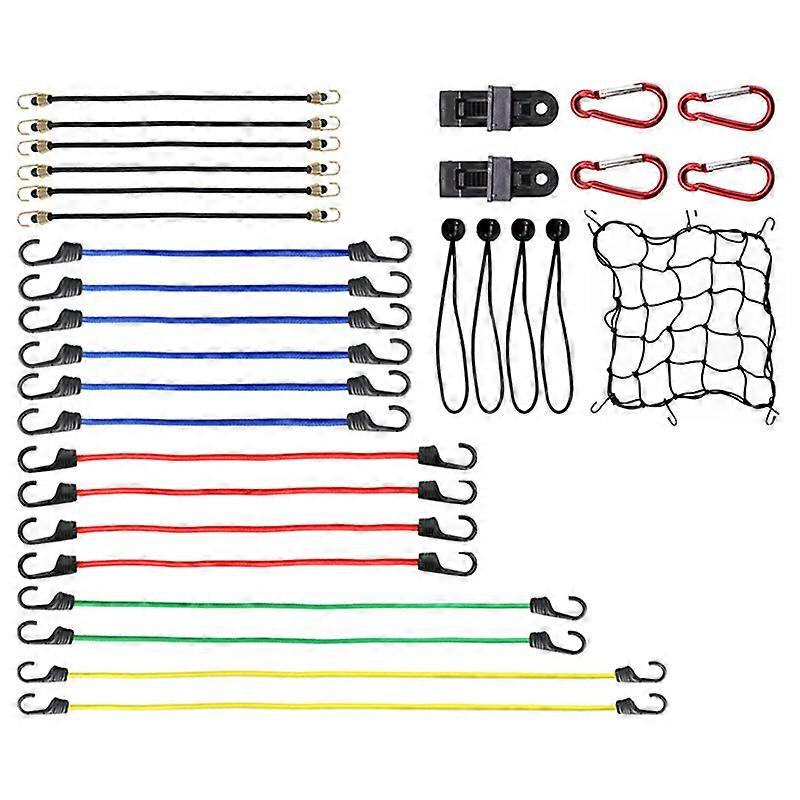 High Quality Bungee Cords with Hooks, Set of 32 Bungee Cords, Tarpaulin Clips, Elastic Net. Comes with carrying case.