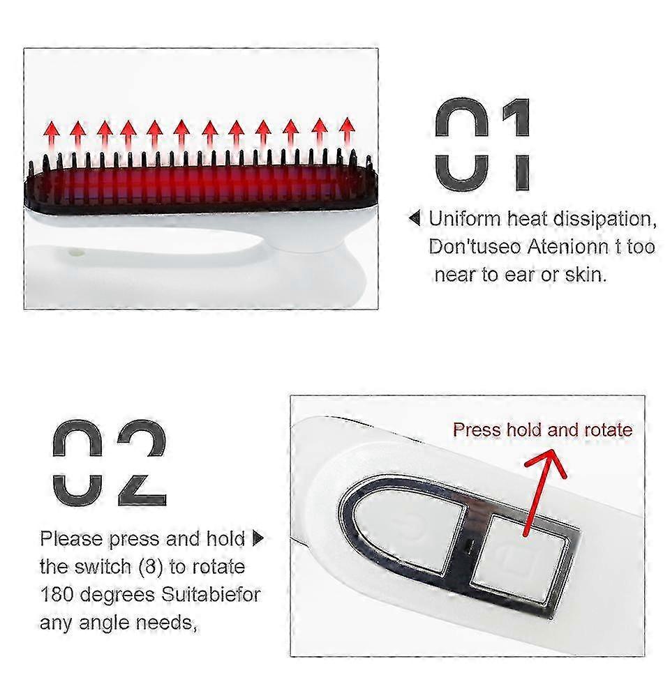 Instructions & Features:1.Product:professional ceramic coating Multifunctional hair straightener curling comb. Flatter side hair.Straighten curly hair.Volume up hair.2.Applicable hair: Dry & wet3.Lightweight ergonomic design.180 degree rotation design, suitable for any Angle needs.4. Innovative Airflow vents. Rapid drying, ionic technology.60% faster drying time.5.Heater:PTC6.Auto shut off after one hour inactivity.7.Fengying has the type of plump hair which effectively relieves the rough stiff and irritable hair.8.Strong support, strong durability and setting force improve the collapse of fine hair.9.Not hurt hair Long-term strong plasticity10.Clean up your hair quickly and quickly11.Prevention and prevention of scald.12.Smooth the management and raise the hair.13.The heat conduction of hollowed-out design is rapid and uniform.14.Ideal temperature for hair.Set at 120C which is the optimum.15.Just comb to solve problems.Stylize your hair within 3 minutes.16.Maintain hair with great volume all day long.Specification:Product Type: Multifunctional hair dryer straightener Modelling comb?Fast Heating, Hair Curler, Anti-Scald, Anti Cord Tangling, Anti Slip HandleGender: Unisexgirl&manColor : WhiteUser: Salon and household both For :adult ,child ,men and womenMaterial of thermal plate/bar: Tourmaline ceramic(PTC)Optimal styling time: 1-3 min.Voltage: General Voltage 110V -240V, 50-60Hz?Power Consumption:25WSize125mm *80 mm*30mmItem weight : 0.25kgPower Cord: approx 2.0m Heater: instant heat up and get you ready in 30 secondsDisplay: LED indicatorFunction: Condition, smooth and make hair shinier, while reducing frizz and static.Temperature: Professional styling temperature, suitable for all hair typePlug type: EU.US.UK(Add adapter).AU (Add adapter)on/off switchEasy to operate, one-button switch.Package Content:1* Hair modelling comb,Gift,1* Gloves,1* Salon Comb,2* hair clip