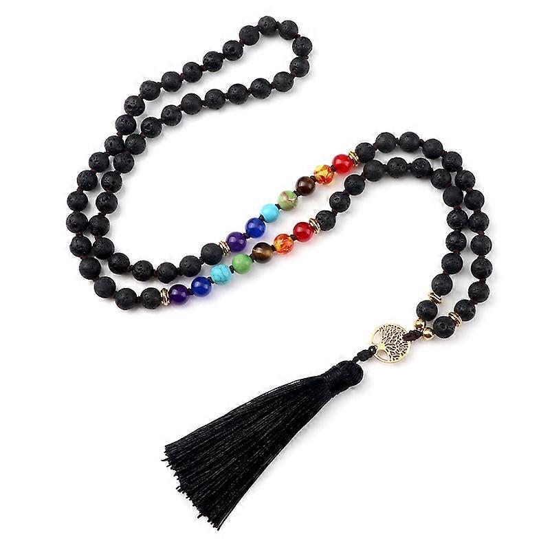 Natural Lava Stone 7 Chakra Knotted Necklace Men Women Charm 6mm8mm Mala Beads Healing Tassel Necklace Life Tree Pendant Jewelry
