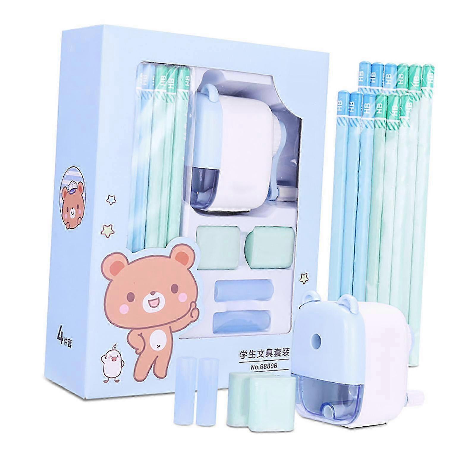 Cute Student Stationery Set with Pencils Pencil Sharpener Eraser Cartoon Stationery Set for School Blue