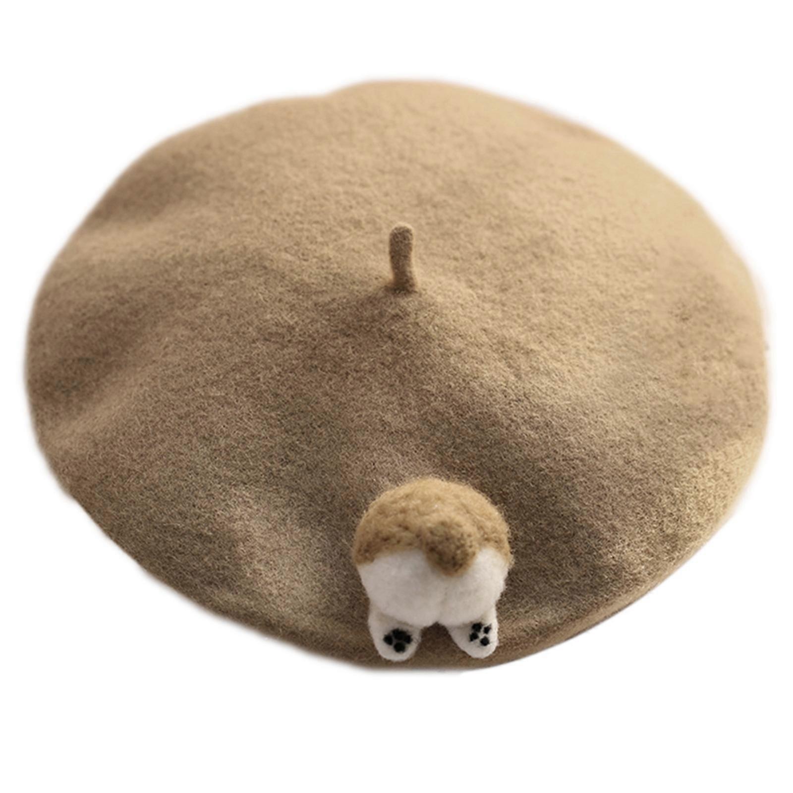 Cute Corgi Butt Beret Elegant Solid Color Beanie Hat Wool Lolita Painter Hat for Family Gatherings Friend Birthday Camel