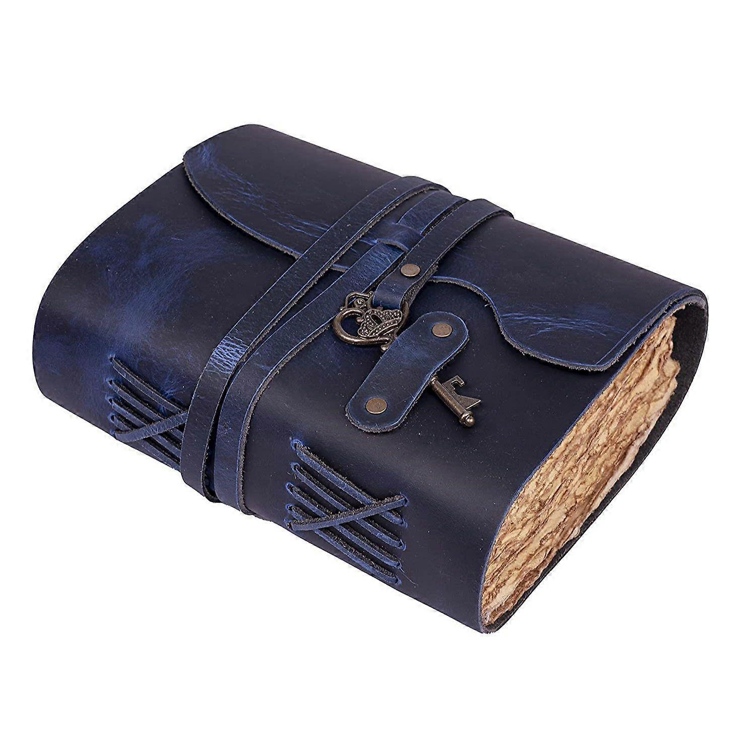 Handmade Vintage Leather Diary - Vintage Handmade Pages - Antique Key Closure - Blue Color. Size 6x4 inches