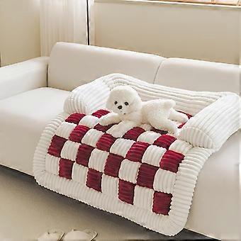Fluffy Calming Dog Bed Sofa Protector, Washable Plush Couch Cover, Cream Square Plaid Cozy Mat, NonSlip (Grey Red)
