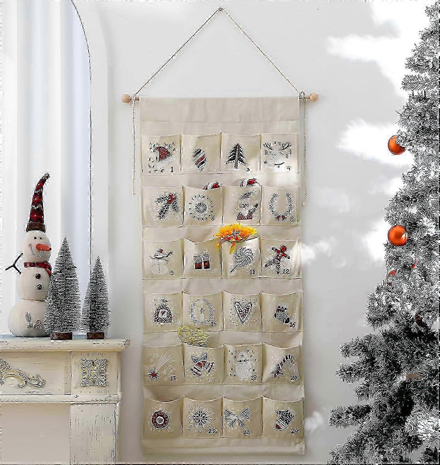 Monoblanks Fabric Christmas Advent Calendar With Pockets,reusable Natural 24 Days Countdown Advent Calendar Hanging Storage Bag For Xmas Holiday Home