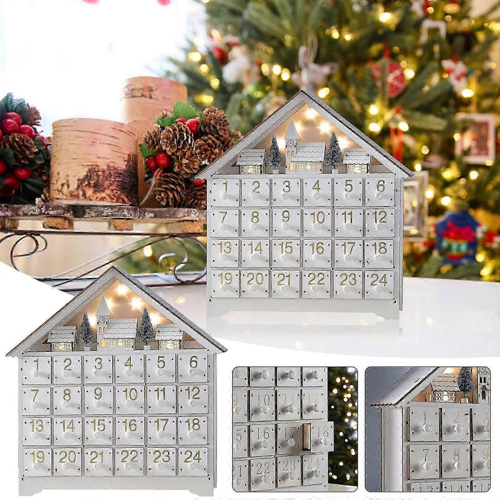 Christmas Wooden Advent Calendar With LED Light 24 Storage Drawers Christmas Countdown Calendar For Festive Decoration Features: Material: Made of natural wood, strong, durable and reusable. It is not easy to break and deform with long-term use. You can paint in any color you like. Spacious drawers: 24 uniquely numbered drawers designed to count down the days of Christmas, and you can stuff boxes with candy, cookies, small gifts and other children's snacks. Built-in LED lights: The calendar comes with LED lights (batteries not included) to up your home and add more festive spirit. The perfect decoration advertising calendar to celebrate the Christmas holidays. Beautiful interior or outdoor decoration: Add to your Christmas holidays with this eye-catching artificial Christmas tree decoration. Add some color to your winter and Christmas with this wonderful wall decoration. Multipurpose: Holiday dcor adds personality and warmth to your home, from front doors, mirrors, windows or walls, from kitchens, living rooms, dormitories, to offices. Personalized Christmas decorations provide you and your guests with a warm welcome for festive and special . Product Description: 1x ornaments Christmas Wooden Advent Calendar House with 24 Drawers, Countdown to Christmas for Kids, LED Home Decoration, L16.25 x H17.9 x T2.87 inches, Battery Operated Materials:Wood FeatureThis 2xAA battery-powered LED Christmas Advent Calendar will make your homes Christmas more warm and lively. This illuminated Advent Calendar will definitely match your homes Christmas decorations perfectly