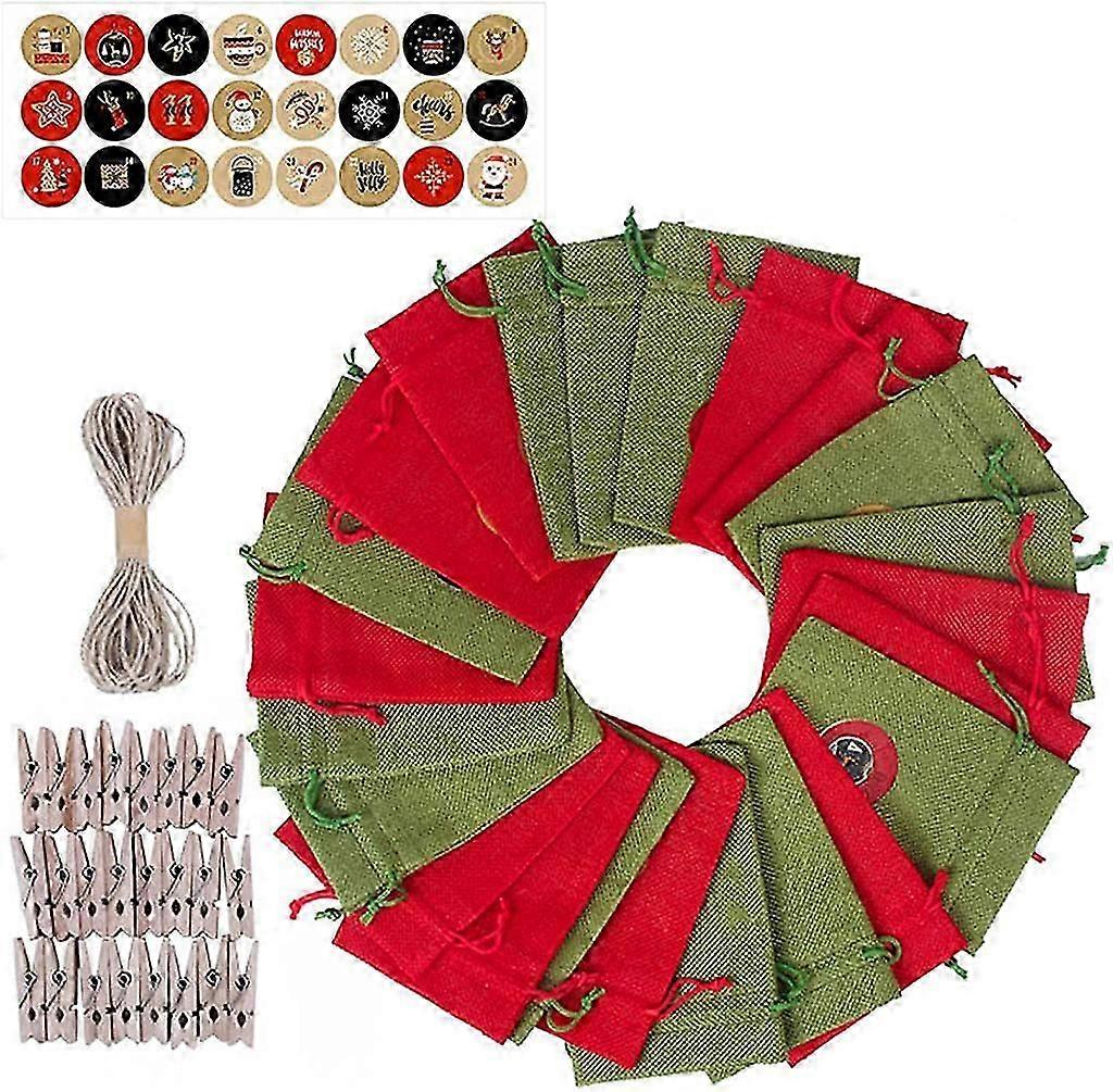Christmas Advent Calendar Bag Set Linen Bags Stickers Wooden Clips Rope Kit for DIY Xmas Gift Greeting Card Candy Pocket