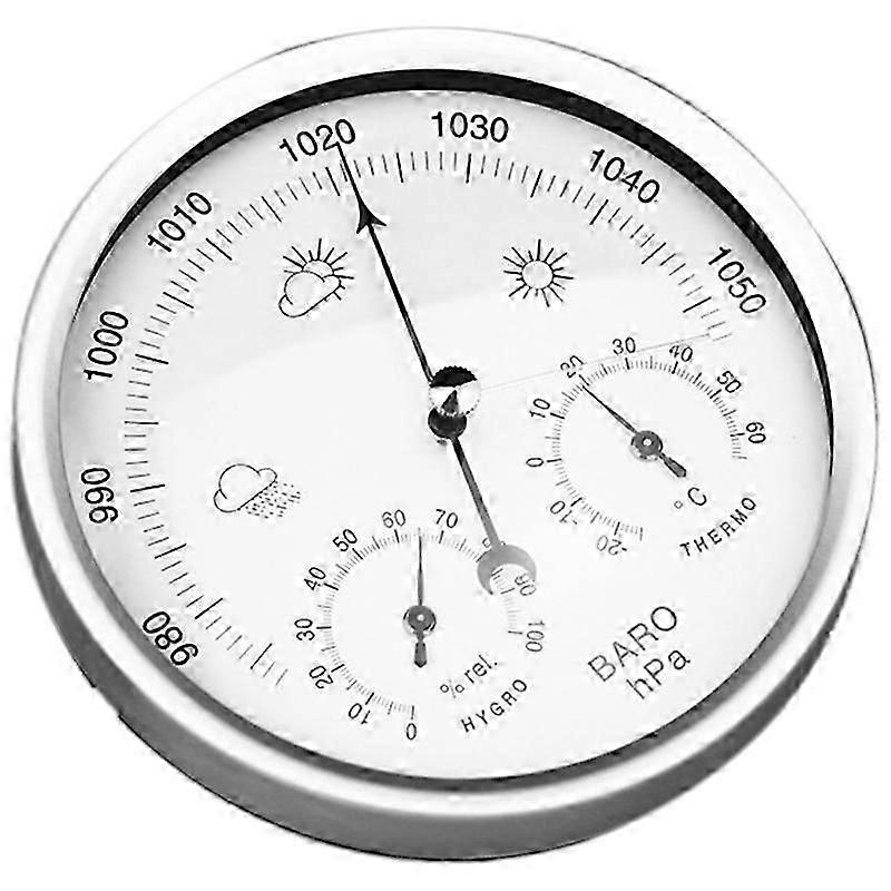 Description Put Anywhere you want, convenient mounting feature for every type of room like kitchen, basement, baby nursery room, guitar room and office. Lightweight and easy to install, suitable for hanging or placing on a surface With barometer, thermometer and hygrometer, 3 in 1 multifunction, economical and practical Standard measuring range, predict the weather more accurately size:13.2cm Material:Metal + plastic colour:Silver Package Contents: 1 * Thermometer Hygrometer Barometer( 3 IN 1 Weather Station Thermomete) Only the above package content, other products are not included. Note: Light shooting and different displays may cause the color of the item in the picture a little different from the real thing. The measurement allowed error is +/- 1-3cm.
