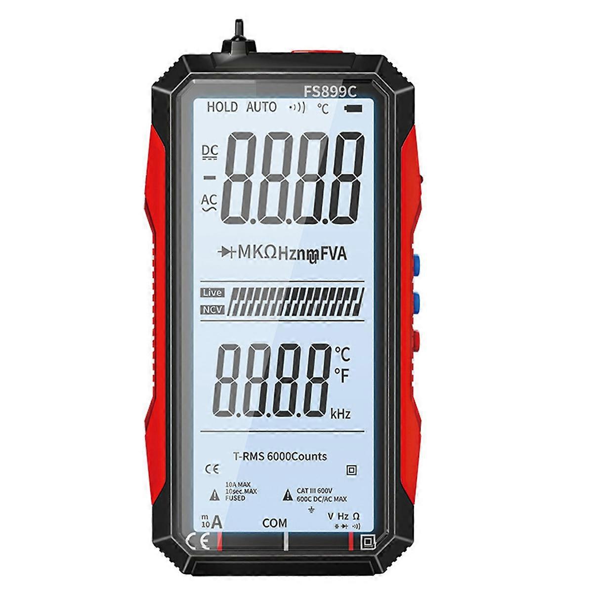 The slim voltmeter with a large LCD backlit screen and the minimalist button design allows you to easily switch all functions with one hand. Can accurately measure voltage, resistance, current, capacitance, frequency, temperature,diodes, live & n-ull wire. Our multimeter tester has non-contact voltage detection function to detect the presence of voltage. Convenient features like flashlight, backlight, on-off beep, Data Hold, Auto Shut-off. Suitable for distribution box, electrical circuit, home users, diy and professional electricians and technicians. Size: 152x73cm/59.8x2.87in Max. display value: 6000 digit. Automatic range: Yes Buzzer test on and off: Yes Diode test: Yes Data retention: Yes Automatic shutdown: Yes Dc voltage range: 6V/60V/600V Ac voltage range: 6V/60V/600V Dc current range: 6A/10A Ac current range: 6A/10A Capacitance range: 10NF 100NF Maximum display: full screen Colour:red+black Material: ABS Package Contents: 1x Digital Multimeter 1x USB Cable 1x English Manual
