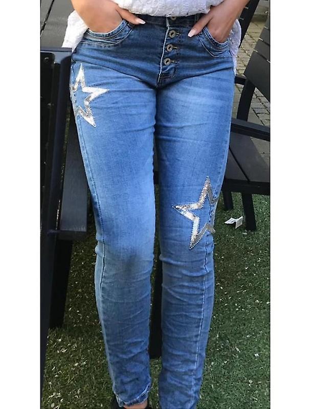 Snygga ljusa jeans med knappar framtill och stjärna på byxorna Färg: LjustvättStorlek: S/36- XL/42 , Mer stora än små i storlek.Tvättråd: 30 graderMaterial: 97% Bomull, 3% Elastane