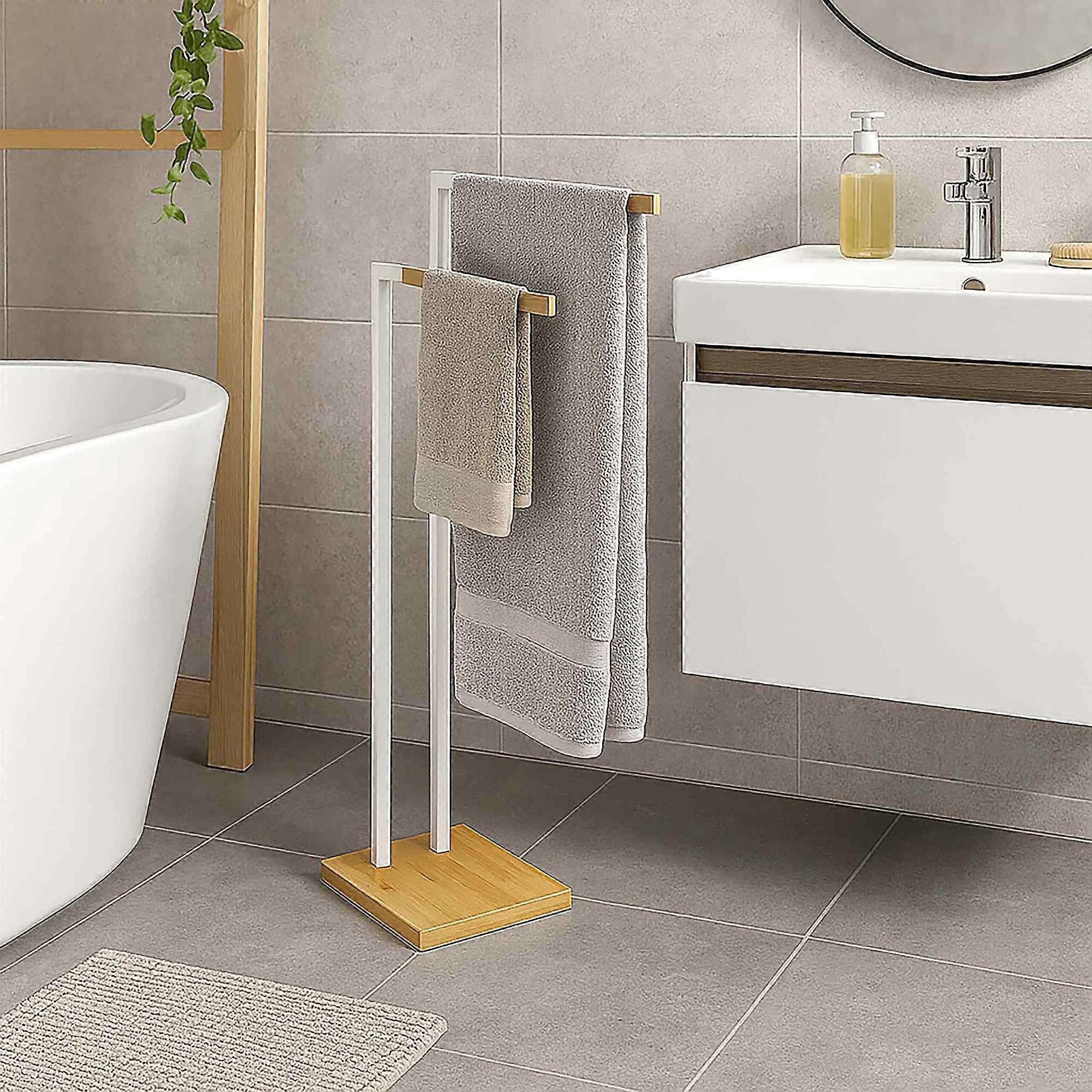 Öka badrumseffektiviteten med denna moderna handdukstork, med en design i bambu och metall för platsbesparande handdukstorkning. Fristående och mångsidig, kräver ingen borrning för installation. Passar var som helst med en fristående design, ingen borrning behövs. Inkluderar två stänger för att torka flera handdukar samtidigt. Ger stabilitet med en tung bottenplatta och halkfria dynor. Kombinerar stil och funktion med bambu- och metalldetaljer. Optimerar utrymmet i badrum och gästtoaletter. Uppgradera ditt badrum med denna snygga och praktiska handdukstork. Dess eleganta design och enkla installation gör den till ett perfekt tillskott till alla utrymmen. Skaffa din idag och njut av en smidig handdukstorkning. Specifikationer Material: Bambu och metall Design: Fristående med två stänger