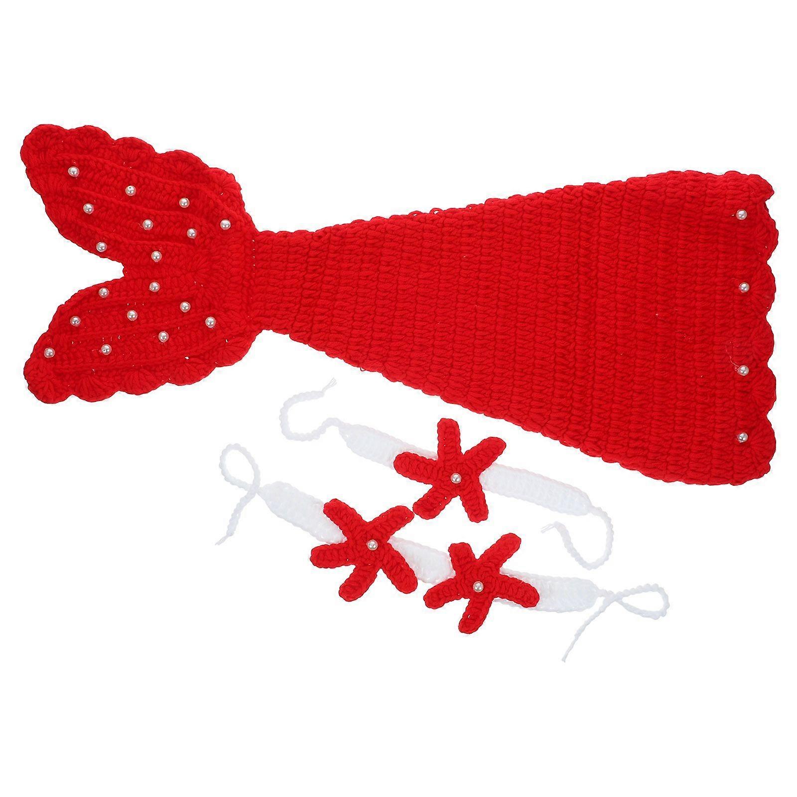 1 Set/3PCS Lovely Newborn Mermaid Photography Props Baby Costume Infant Knitting Crochet Sweater Cosplay Tail Suits (Red)