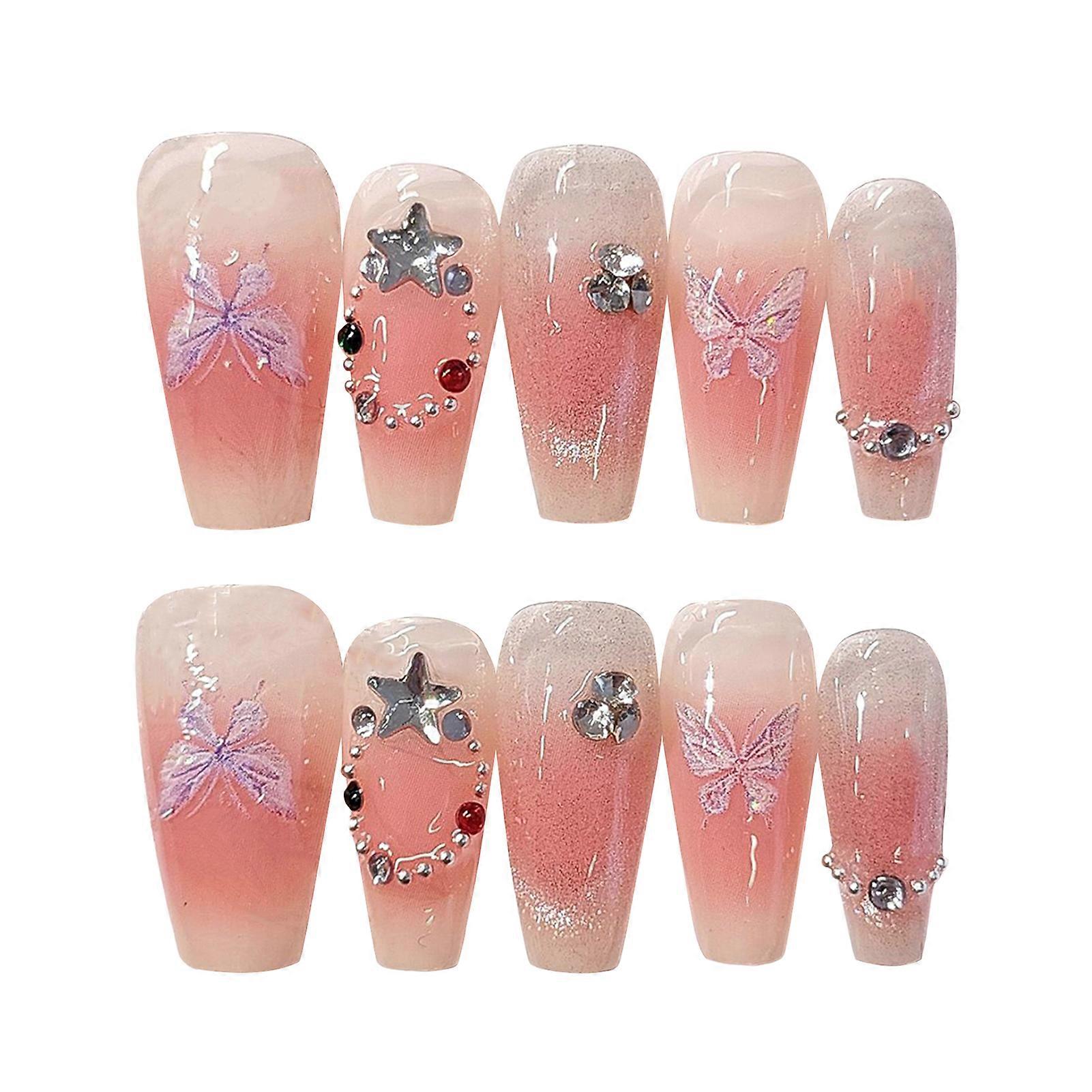 Features: Glamorous Nail Designs: These 10PCS Glitter Fake Nails with Butterflies Decor and Rhinestone accents are sure to make your nails stand out. Create stunning nail art with these tender glossy press-on nails and add a touch of charm to your fingertips. Long-Lasting and Durable: Made from high-quality resin, these 10PCS French Pink Long Resin Nail Extensions are ultra-flexible and designed to last. Say goodbye to nails that split or break easily, as these false nails are built to withstand daily wear and tear. Easy Nail Art Decoration: Achieve salon-quality 3D nail art with these charming fake nails. The intricate designs and decorations make it easy to create eye-catching manicures, perfect for beauty bloggers and manicure lovers alike. Versatile Usage: Whether you're shopping, traveling, or going on a date, these fake nails are suitable for all occasions. They are designed for women and girls who love to DIY their manicures, adding a touch of elegance and style to any outfit. Manicure Lovers' Choice: These fake nails are a must-have for manicure enthusiasts. They offer a long-lasting, salon-quality manicure experience at the comfort of your own home. Perfect for beauty bloggers looking to showcase their creativity and style. Specifications: Material: Resin Quantity: 10PCS Size,Thumb(mm),Index Finger(mm),Middle Finger(mm),The Fourth Finger(mm),Little Finger(mm) XS,14,10,11,10,7 S,15,11,12,11,8 M,16,12,13,12,9 Notice: 1.Actual color may be slightly different from the image due to light effect. 2.Please allow 1-3cm deviation due to manual measurement. Include: 1 Set * False nails (10pcs included) 10PCS * Jelly glue 1 * Nail rub strip