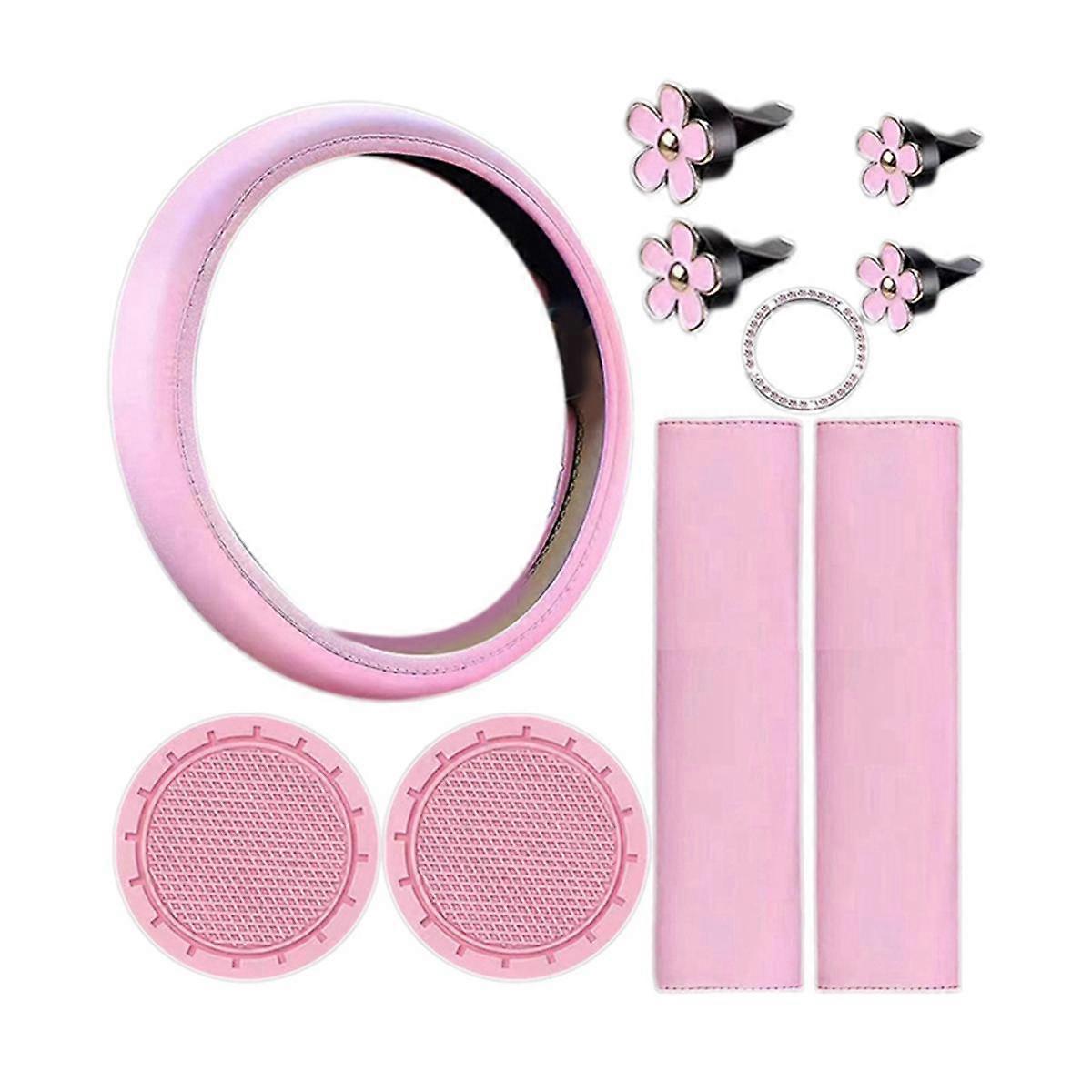 10 Pcs Steering Wheel Cover for Women Cute Car Accessories Set with Seat Belt Shoulder Pads Cup Holders Pink