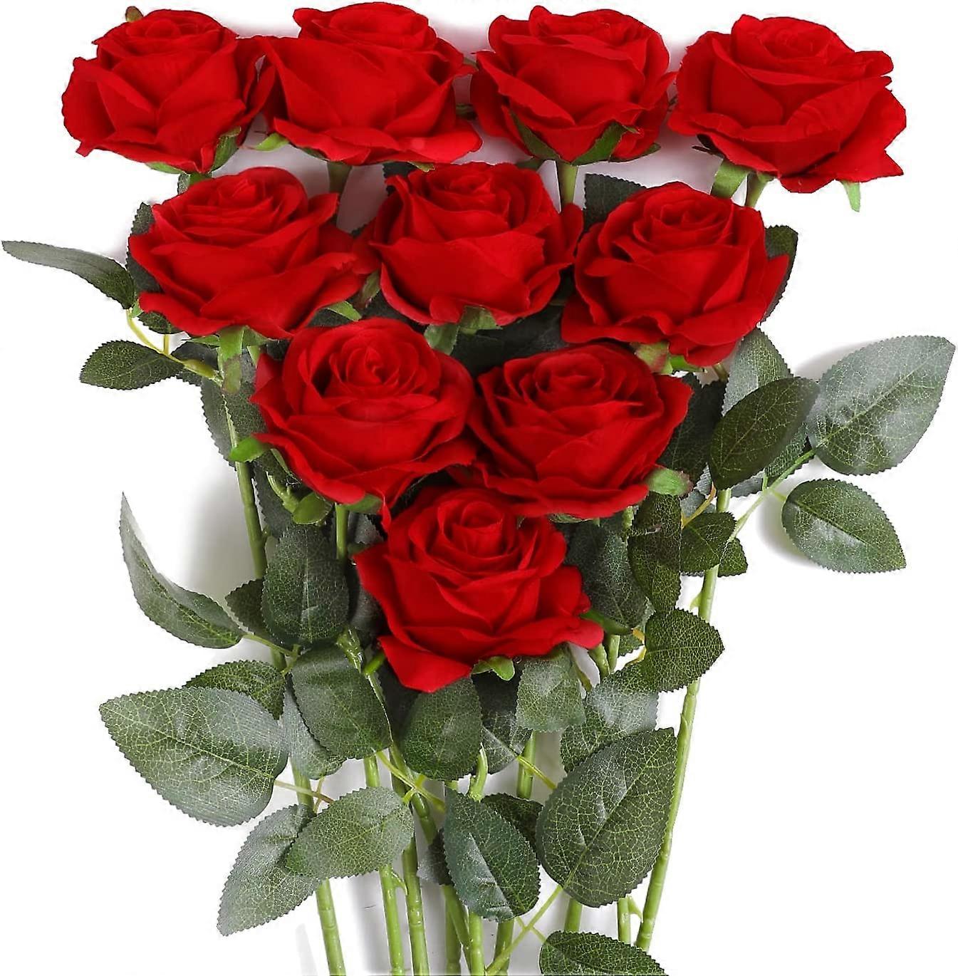 10 PCS Artificial Red Roses Flowers for Valentine's Day, Realistic Blossom Roses, Real Touch Silk Rose, Single Fake Flower Long Stem Bouquets for Home