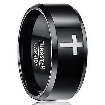 10mm Ανδρική Μαύρη Μπάντα Γάμου Βολφράμιο Δαχτυλίδια Λέιζερ Σταυρός Μοτίβο Λοξότμητη Άκρη Γυαλισμένο Φινίρισμα Άνεση Fit Μέγεθος 7-12
