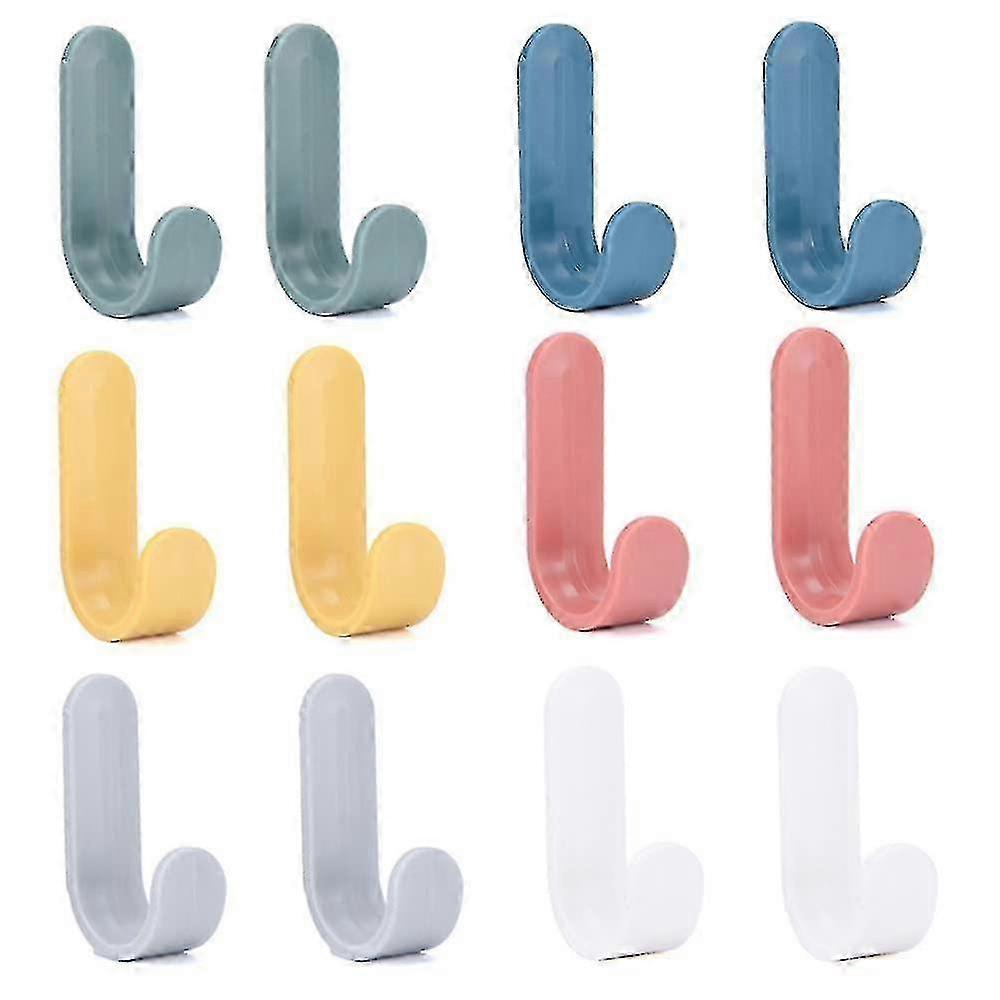 12 Self-Adhesive J-Shaped Plastic Hooks for Wall, Sticky Hooks for Towels, Keys & More in Mixed Colors