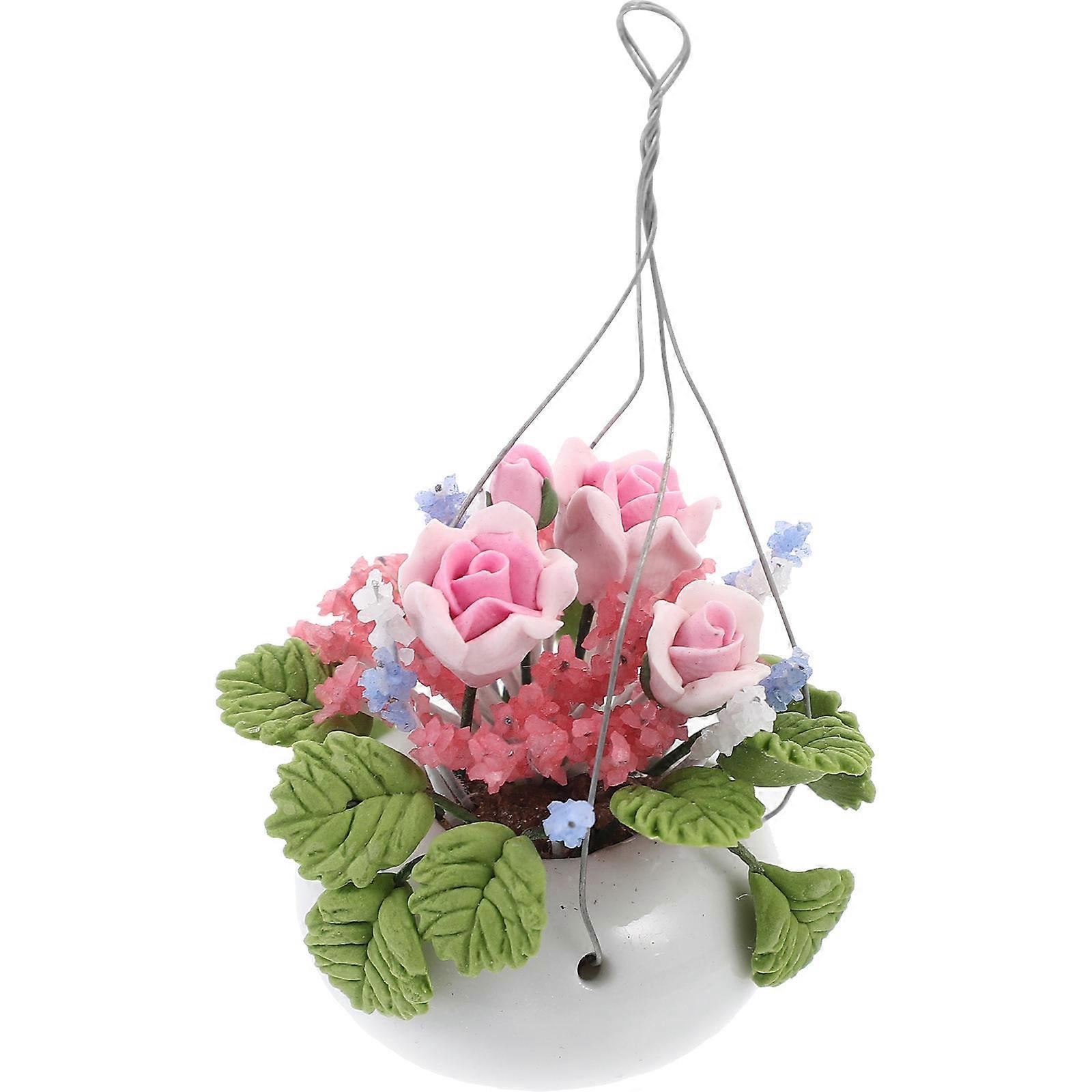 1PC 1/12 Mini House Potting Adornment Mini Pink Rose Hanging Basket Flower Arrangement Model for Home Decor (Pink+Green)