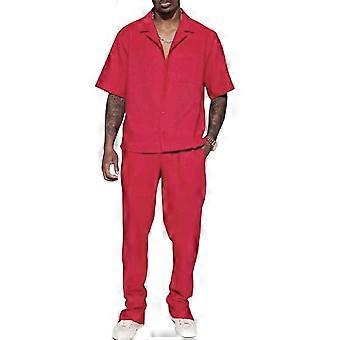 2Pcs/Set Men Outfit Lapel Short Sleeve Single Breasted Shirt Elastic Waist Long Pants Set Solid Color Loose Fit Casual Outfit