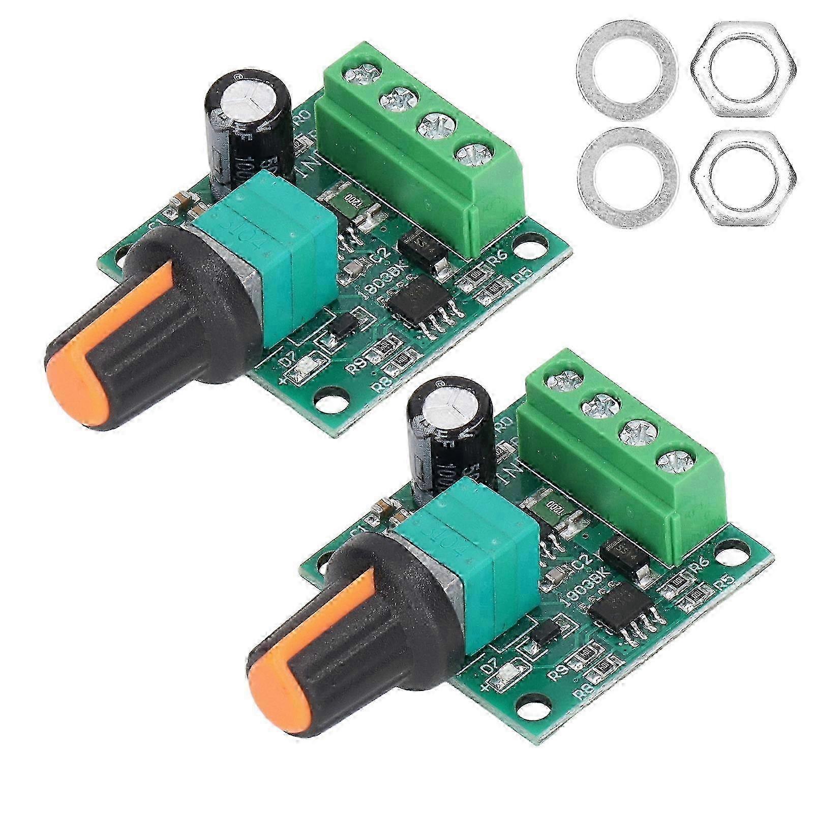 Features 1,Smart Control: Through PWM control, the motor speed controller can adjust the input voltage to DC 1.8V, 3V, 5V, 6V and 12V. 2,Better Design: This ultra low volt DC motor regulator also has potentiometer with switch function and power on indicator. 3,Higher Safety: The resettable fuse will automatically disconnect under high current, which will recover when cooling down. 4,Practical Use: Allows for wide application on fans, fish tank oxygen pumps and other devices, very stable and practical. 5,Easy to Install: Comes with a compact size and a light weight as well, the installation is very convenient to complete. Specification Item Type: Motor Speed Controller Material: PCB Speed Switch: 1803BK Maximum Output Power: 30W Maximum Continuous Output Current: 2A Package List 2 x Motor Speed Controller 2 x Speed Control Knob 2 x Washer 2 x Nut Note: Due to the light and screen setting difference, the item's color may be slightly different from the pictures. Please allow slight dimension difference due to different manual measurement.