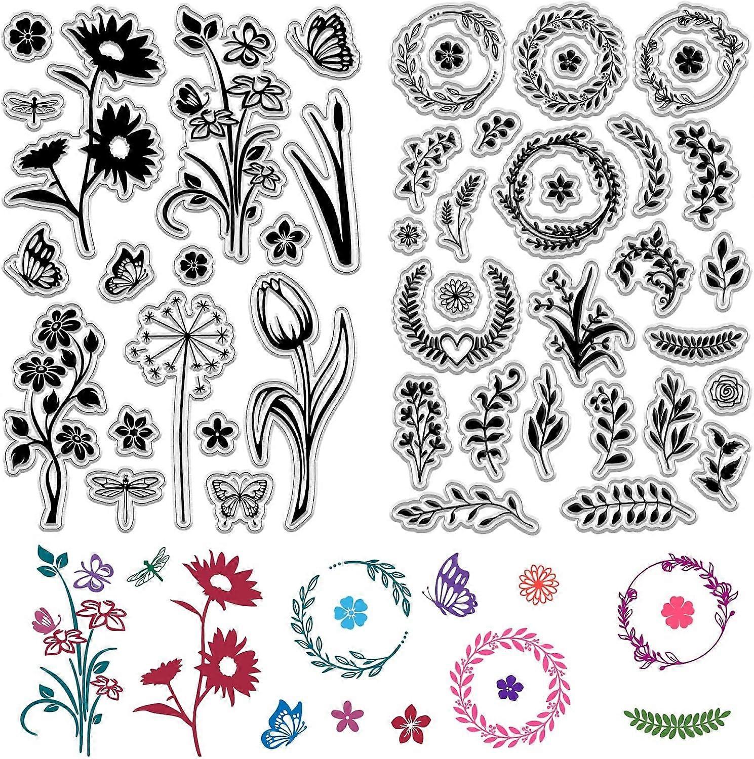2 Styles Wreath Clear Stamps Butterfly Tulips Dandelions Daisies Plant Flowers Leaf Reusable Transparent Silicone Stamp Seals Postmark for DIY Scrapbo