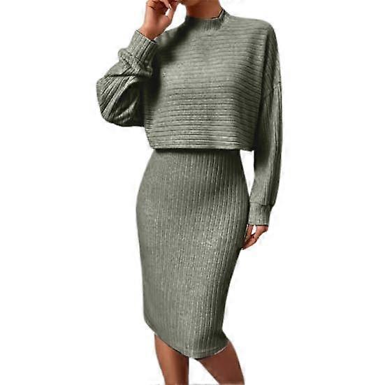 2 Pcs/Set Women Top Dress Suit Mock Collar Thread Long Sleeve Sweater V Neck Sheath Slim Fit Sleeveless Solid Color Midi Dress Commuting Dating