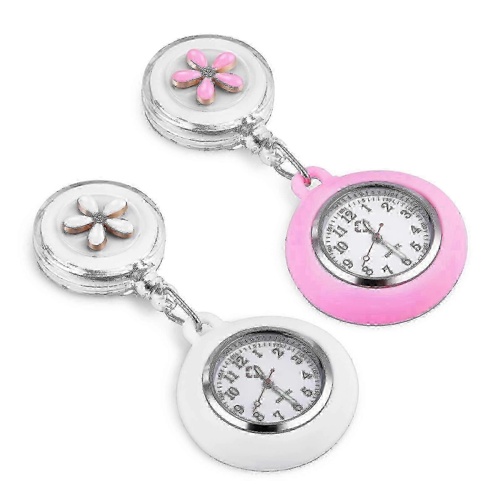 2PCS Retractable Nurse Watch, Clip-on Hanging Nurse Fob Watch, with Cute Flower Pattern and Silicone Cover for Doctors, Paramedics