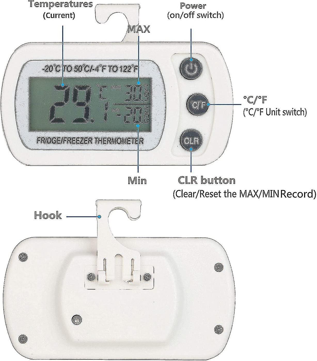 2 Pcs Digital Fridge Freezer Thermometer Temperature -20 To 50 C With Hook, Easy To Read Lcd Display, Max Min Record Function (white)
