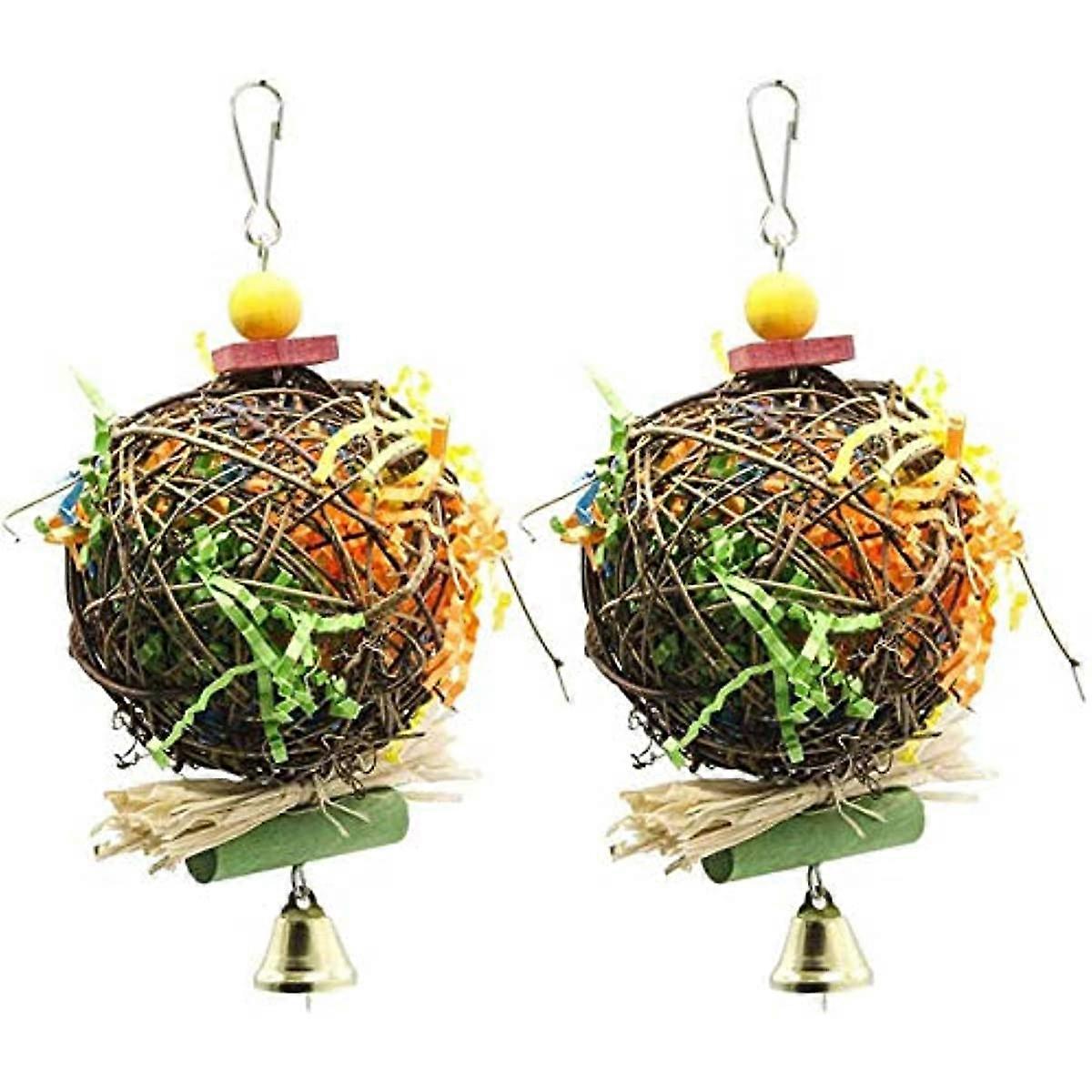 Pack of 2 Bird Chew Toys Natural Rattan Ball Come with Paper Strips Foraging Shredder Toy Parrot Cage Hanging Bell Toy for Parrot Budgie