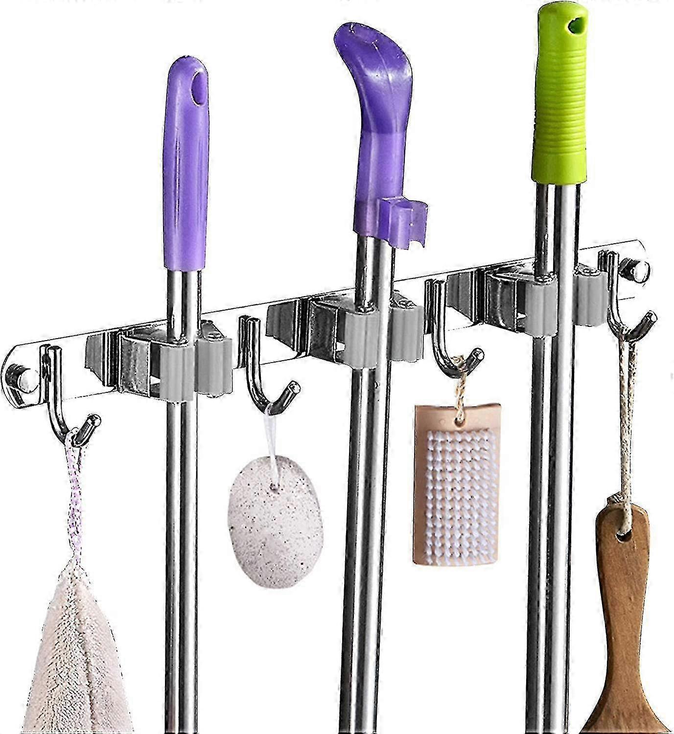 2025 Gray Wall Mounted Broom Holder - Stainless Steel Broom Holder, Storage Hanger Holder For Kitchen, Laundry, Garage (3 Slots And 4 Hooks)