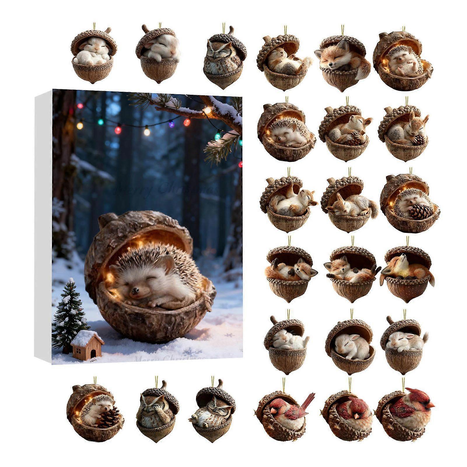 2025 Forest Animal Acorn Ornaments Christmas Advent Calendar Cozy Pinecone Animals Countdown Decoration 2D Acrylic Forest Animal Ornaments for Xmas Tr